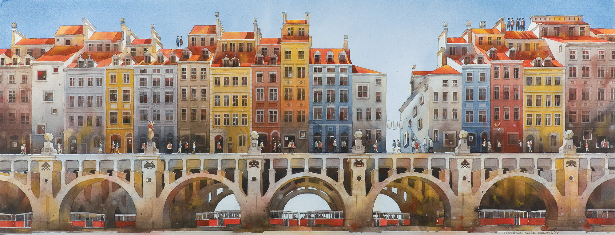 Tytus Brzozowski (Warszawa 1984, mieszka w Warszawie) - ukończył Wydział Architektury Politechniki Warszawskiej, jest akwarelistą i architektem zafascynowanym duszą miasta. Często zestawia sylwetki gmachów i ludzi, tworząc barwne, pogodne sceny z pogranicza rzeczywistości i fantastyki. Jego ulubioną bohaterką jest Warszawa. Pomimo surrealistycznego posmaku, obrazy związane są z prawdziwą historią polskich miast. Artysta niekiedy wychodzi poza sferę akwareli, tak jak zrobił to na potrzeby projektów sześciu warszawskich murali, wielkoformatowej książki obrazkowej Miastonauci, a także pejzaży zrujnowanej stolicy do filmu Po apokalipsie.