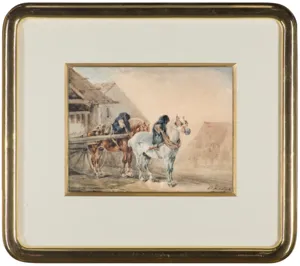 Po klęsce powstania listopadowego artysta wyjechał do Paryża, gdzie przebywał w latach 1832-1835. Na ten właśnie okres przypada czas powstania prezentowanej akwareli. Wskazuje na to zarówno stylistyka dzieła, jak i uproszczona sygnatura.