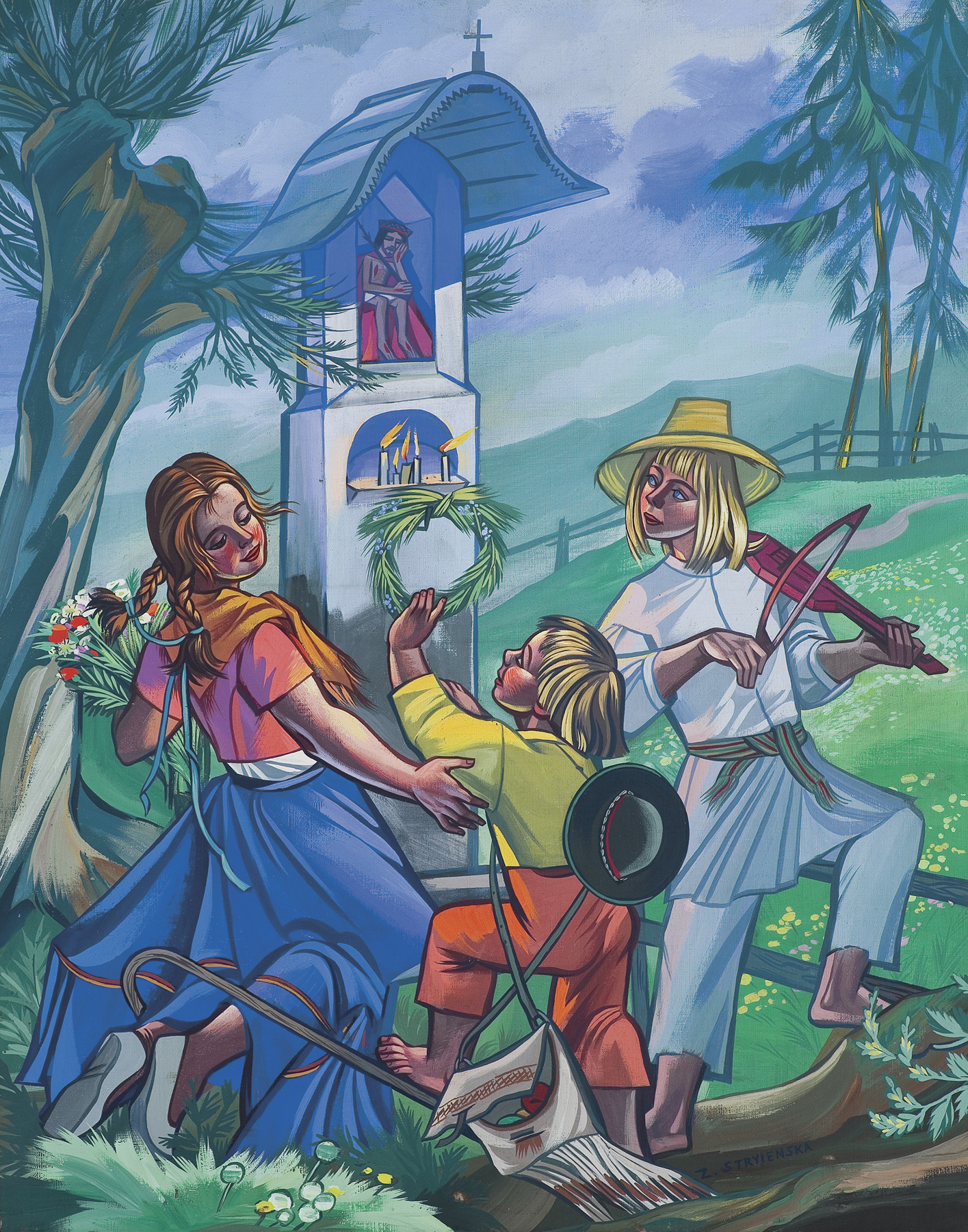 Zofia Stryjeńska, z domu Lubańska (Kraków 1891 - Genewa 1976) - malarka, ilustratorka, scenograf - była jedną z barwniejszych postaci polskiego środowiska artystycznego w dwudziestoleciu międzywojennym. Po krótkim okresie nauki u Leonarda Stroynowskiego i w krakowskiej szkole Marii Niedzielskiej wyjechała do Monachium, gdzie w latach 1911-1912 w męskim przebraniu studiowała w Akademii Sztuk Pięknych (kobiet wówczas na studia nie przyjmowano). Debiutowała w krakowskim TPSP w roku 1912 cyklem kartonów Polskich bajd inspirowanych opowieściami ludowymi. W 1916 wyszła za mąż za Karola Stryjeńskiego. Do 1919 mieszkała w Krakowie, później w Paryżu, Krakowie, Zakopanem i Warszawie. W roku 1925 odniosła międzynarodowy sukces na Wystawie Sztuki Dekoracyjnej w Paryżu, otrzymując Gran Prix w czterech działach (malarstwo, plakat, tkanina, ilustracja) oraz Diplom d’Honneur za projekty zabawek. Zajmowała się dekoracyjnym malarstwem architektonicznym, polichromią, ilustratorstwem, scenografią (m.in. Harnasie Karola Szymanowskiego; 1938), wzornictwem przemysłowym (projekty kilimów, zabawek). Stworzyła własny specyficzny styl w dekoracyjnie stylizowanych, barwnych, pełnych dynamiki i temperamentu obrazach; temperach, akwarelach i gwaszach. W ich tematyce odwoływała się do legend, wierzeń, historii i obyczajowości ludowej. Wydała kilka tek graficznych (Bożki słowiańskie, 1917 i 1922) i albumów reprodukcji (Tańce polskie, 1927; Pascha, 1929; Piastowie, 1929; Gusła Słowian / Magie Slave, 1934). Jej prace popularyzowane były także przez liczne barwne pocztówki.