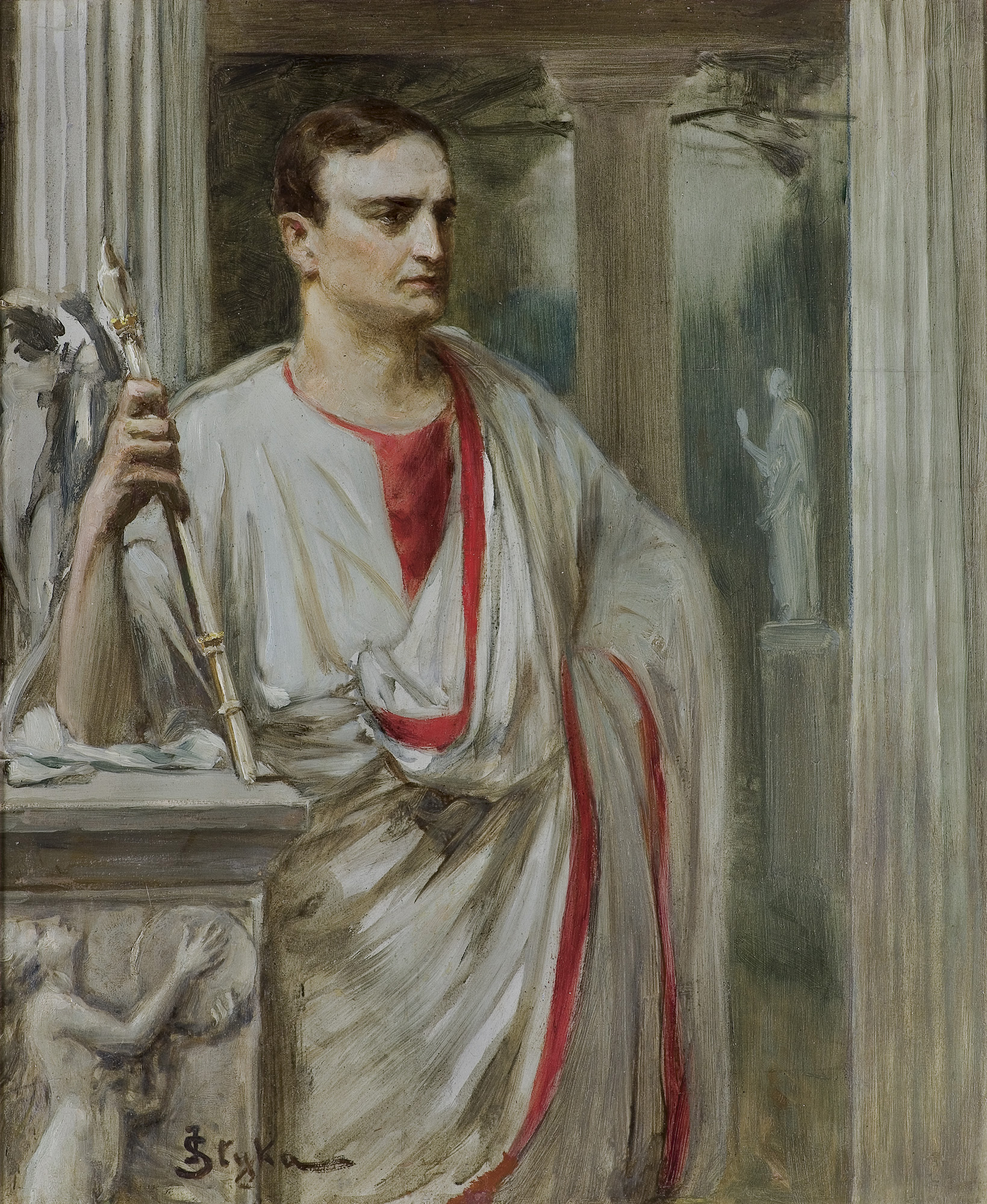 Na odwrocie l.g. (czarną kredką): Pétrone [...] | C [...]; poniżej różową kredką: 11; p.g. (niebieską kredką): 048 [w kółku]; centralnie (niebieską kredką): 84 | 12 [w kółku] | 3829 | d JS #5; z lewej (czarną kredką): Jan Styka 1900. | Paris.; p.d. 56 x 48.