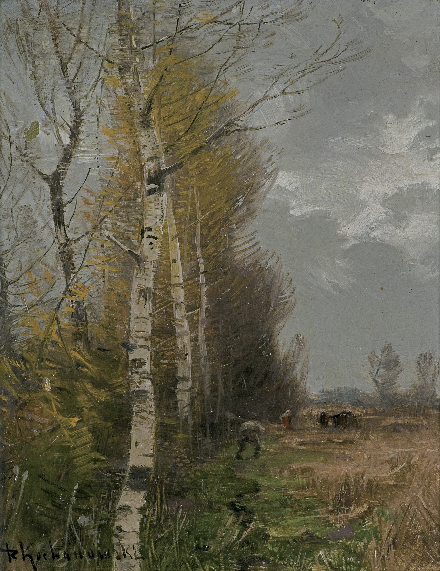 Roman Kochanowski (Kraków 1857 - Freising k. Monachium 1945) - malarz i grafik - był jednym z polskich artystów osiadłych i stałe działających w Monachium. Studia malarskie rozpoczął w Krakowie; początkowo w prywatnej pracowni Maksymiliana Cercha, a w latach 1873- 1875 w Szkole Sztuk Pięknych u Władysława Łuszczkiewicza i pejzażysty Henryka Grabińskiego. Przez następne dwa lata uczył się jeszcze na wydziale pejzażu w Akademii wiedeńskiej. W 1881 przeniósł się do Monachium, gdzie miał własną pracownię, a niebawem założył rodzinę. Często jednak przyjeżdżał do Krakowa, bywał w Poznańskiem, odbył podróż po Galicji i Podolu, rysując krajobrazy i widoki miast, które weszły następnie do albumu wydanego w Wiedniu w roku 1898. Artysta należał do monachijskiego Kunstvereinu, brał udział w wielu wystawach w Niemczech, w Wiedniu, w Londynie; swoje prace przesyłał też na pokazy krajowe. Malował przede wszystkim pejzaże a tylko z rzadka kwiaty i portrety. Stałym i ulubionym motywem jego obrazów był polski, podkrakowski krajobraz z wplecionymi weń postaciami ludzi. Obrazy artysty, malowane często na niewielkich deseczkach, pozbawione warstwy anegdotycznej odznaczają się niecodziennymi walorami malarskimi, harmonią koloru i pełnym liryzmu nastrojem. Zauważane i nagradzane na licznych wystawach były też wysoko cenione na rynku sztuki. W roku 1892, po wystawie w Wiedniu, jeden z obrazów Kochanowskiego zakupił do swoich zbiorów cesarz Franciszek Józef; dwa inne nabyli członkowie cesarskiej rodziny. Wielbicielem jego malarstwa był Karol Józef Luitpold, książę regent Bawarii. Wielka wrażliwość artysty na krajobraz i przyrodę widoczna jest także w jego rysunkach i akwafortach.