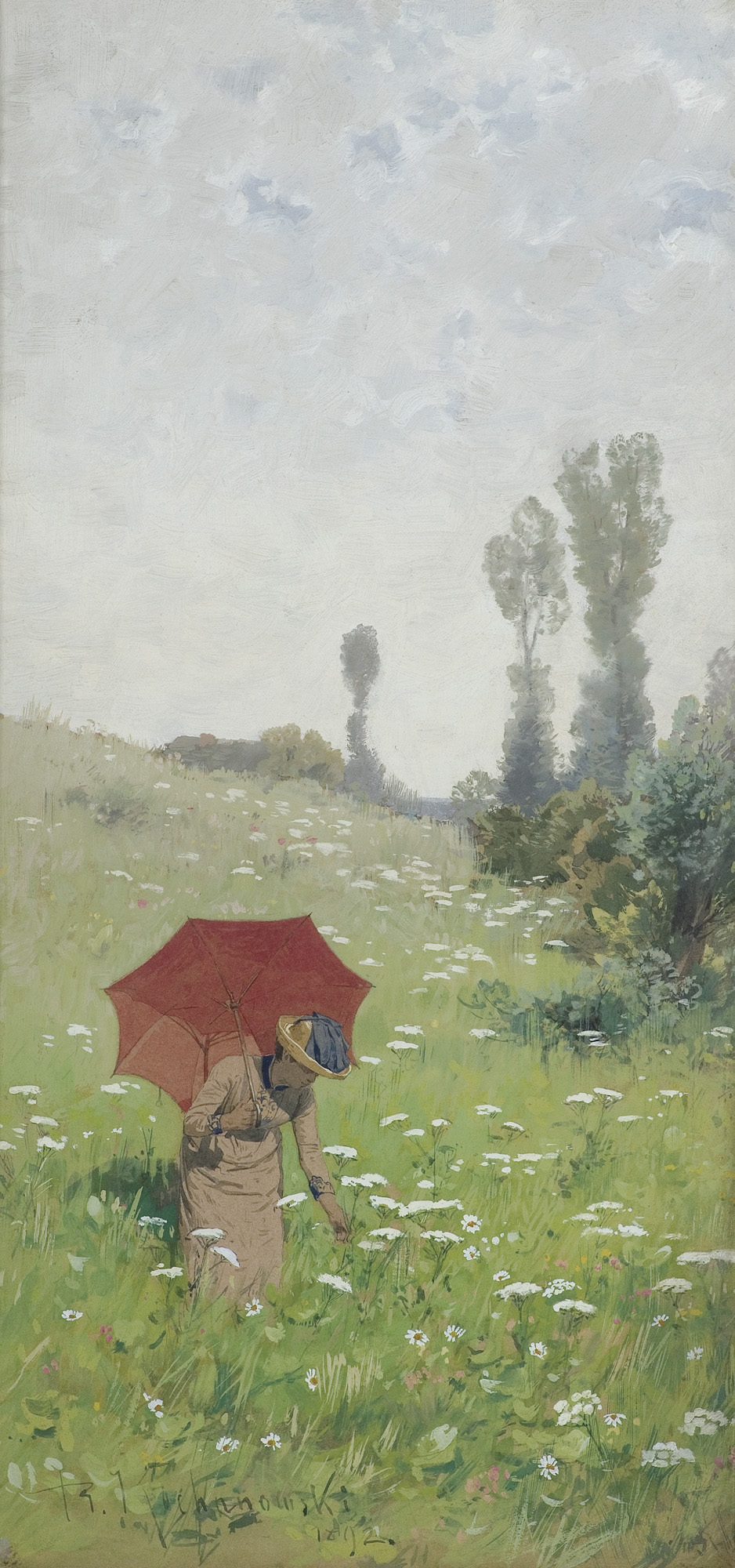 Roman Kochanowski (Kraków 1857 - Freising k. Monachium 1945) - malarz i grafik - był jednym z polskich artystów osiadłych i stałe działających w Monachium. Studia malarskie rozpoczął w Krakowie; początkowo w prywatnej pracowni Maksymiliana Cercha, a w latach 1873- 1875 w Szkole Sztuk Pięknych u Władysława Łuszczkiewicza i pejzażysty Henryka Grabińskiego. Przez następne dwa lata uczył się jeszcze na wydziale pejzażu w Akademii wiedeńskiej. W 1881 przeniósł się do Monachium, gdzie miał własną pracownię, a niebawem założył rodzinę. Często jednak przyjeżdżał do Krakowa, bywał w Poznańskiem, odbył podróż po Galicji i Podolu, rysując krajobrazy i widoki miast, które weszły następnie do albumu wydanego w Wiedniu w roku 1898. Artysta należał do monachijskiego Kunstvereinu, brał udział w wielu wystawach w Niemczech, w Wiedniu, w Londynie; swoje prace przesyłał też na pokazy krajowe. Malował przede wszystkim pejzaże a tylko z rzadka kwiaty i portrety. Stałym i ulubionym motywem jego obrazów był polski, podkrakowski krajobraz z wplecionymi weń postaciami ludzi. Obrazy artysty, malowane często na niewielkich deseczkach, pozbawione warstwy anegdotycznej odznaczają się niecodziennymi walorami malarskimi, harmonią koloru i pełnym liryzmu nastrojem. Zauważane i nagradzane na licznych wystawach były też wysoko cenione na rynku sztuki. W roku 1892, po wystawie w Wiedniu, jeden z obrazów Kochanowskiego zakupił do swoich zbiorów cesarz Franciszek Józef; dwa inne nabyli członkowie cesarskiej rodziny. Wielbicielem jego malarstwa był Karol Józef Luitpold, książę regent Bawarii. Wielka wrażliwość artysty na krajobraz i przyrodę widoczna jest także w jego rysunkach i akwafortach.