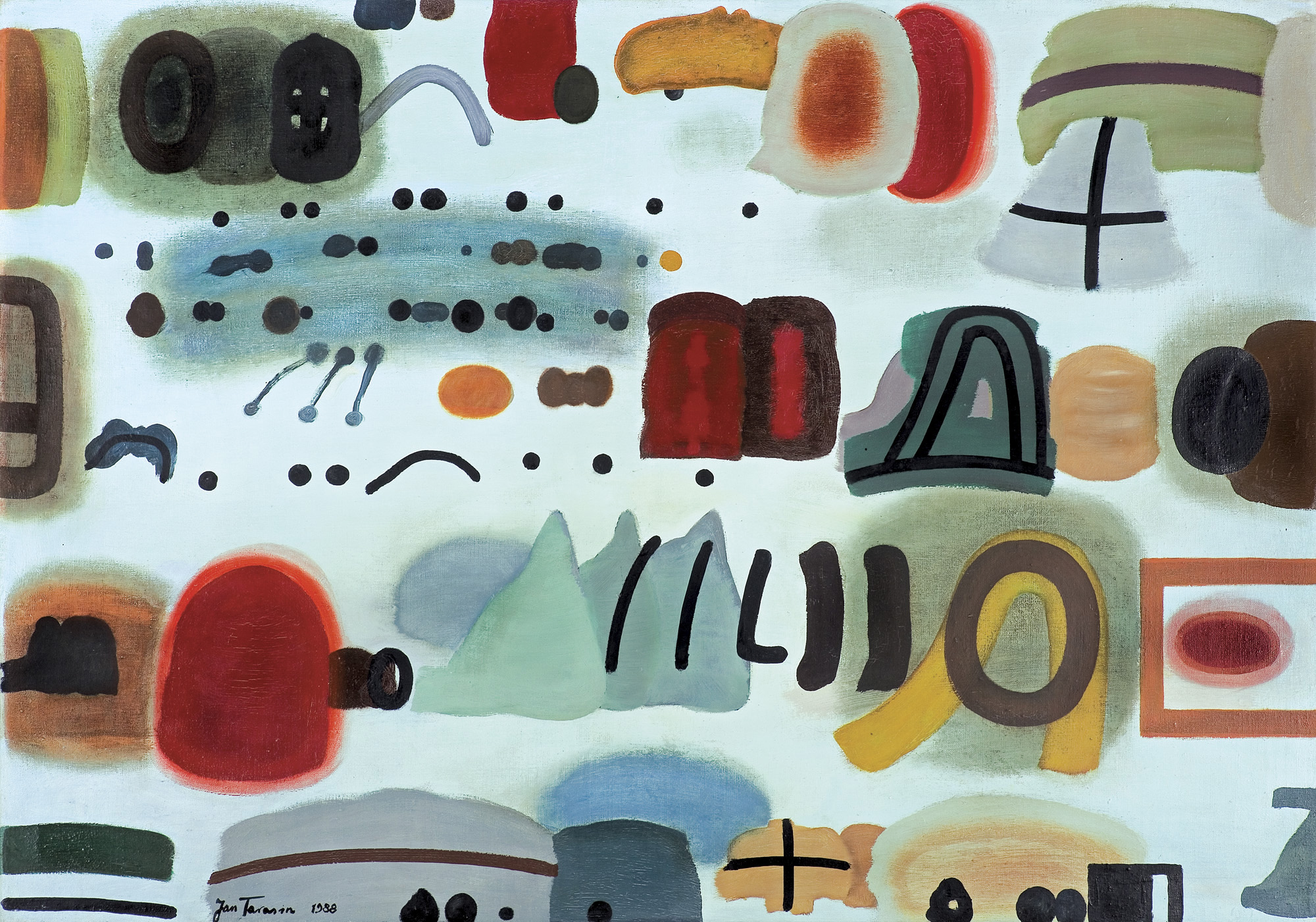 Jan Tarasin (Kalisz 11 IX 1926 - Warszawa 8 VIII 2009) studiował malarstwo w ASP w Krakowie pod kierunkiem prof. Zbigniewa Pronaszki (1946-1951). Jeszcze jako student zadebiutował na I Wystawie Sztuki Nowoczesnej w Krakowie w 1948/49. W połowie lat 50. stworzył cykle litografii: „Nowa Huta i jej mieszkańcy“, 1954, „Dom“, 1955). W pierwszym przeciwstawił się oficjalnemu optymizmowi, w drugim, operując symboliką martwej natury, zawarł treści egzystencjalne i odnoszące do niedawnego dramatu wojny. Po 1956 zaczął malować obrazy niefiguratywne. Układy wyodrębnionych elementów (określanych jako „przedmioty“) umieszczane były przez artystę na płaszczyźnie (cykl „Wnętrze“, 1957) ), lub w aluzyjnej przestrzeni (cykle „Uczta“, 1957, „Brzeg“, 1962-1964, „Przedmioty policzone“, od 1968, „Antykwariat“, 1968). Zasada ta utrzymuje się w jego malarstwie w następnych latach, różnice między okresami twórczości dotyczą sposobu opracowania „przedmiotów“ i ich usytuowania w przestrzeni obrazu lub wobec tła. Od lat 70. „przedmioty“ zmieniają się w graficzne, zwykle czarne znaki na jasnych tłach (cykl „Kolekcja“, od 1971). Tła z kolei bywają iluzyjnie przestrzenne, zróżnicowane walorowo, miękkie. W latach 90. artysta wrócił do kolorystycznego, bardziej malarskiego rozwiązywania zarówno znaków, jak i teł, często ciemnych lub przenikających się z „przedmiotami“ (cykl „Wylęgarnia przedmiotów“, 1992). Tarasin od 1962 jest członkiem „Grupy Krakowskiej“. W 1963-67 uczył na Wydziale Architektury Wnętrz krakowskiej ASP. W 1967 przeniósł się do Warszawy, w 1974 podjął pracę pedagogiczną na Wydziale Malarstwa ASP w Warszawie. W 1987-90 był rektorem tej uczelni. W 1976 otrzymał Nagrodę Krytyki Artystycznej im. Cypriana Kamila Norwida, w 1984 Nagrodę im. Jana Cybisa.; Nagroda na MB Sztuki w San Marino 1965. Równolegle z malarstwem zajmował się rysunkiem i grafiką - do lat 60. litografią, od 1974 serigrafią. W 1974-1981 wydał 8 autorskich „Zeszytów“ z serigrafiami i własnymi tekstami. W 1995 w Galerii Zachęta odbyła się wystawa artysty, której towarzyszył monograficzny katalog.