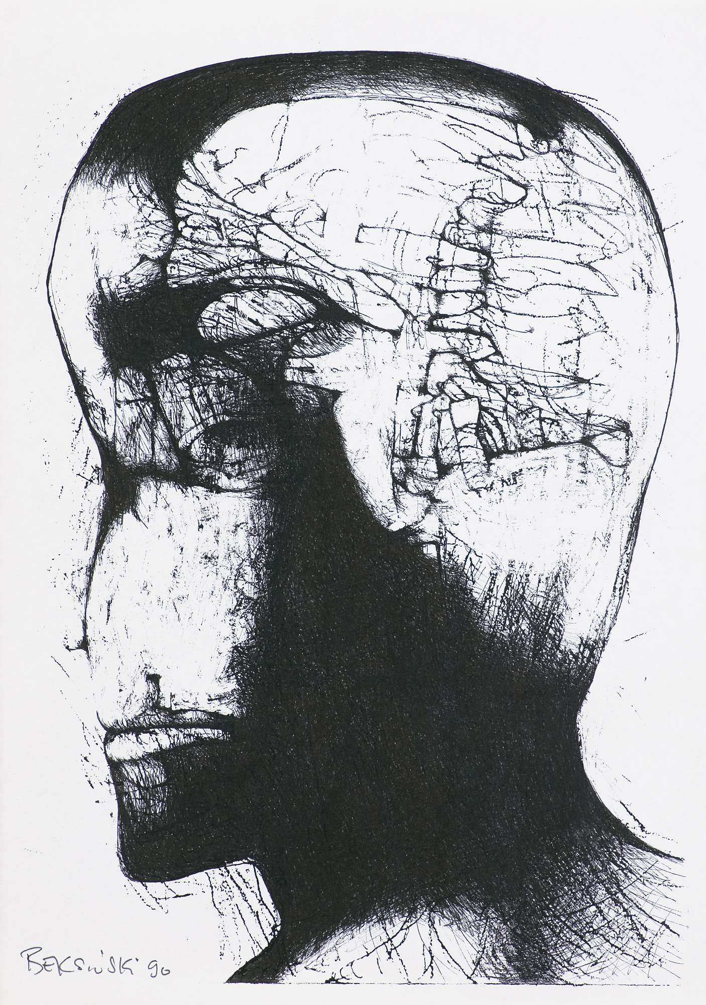 Zdzisław Beksiński (Sanok 24 II 1929 - Warszawa 21 II 2005) studiował w latach 1947-1952 na Wydziale Architektury Politechniki Krakowskiej. Był artystą samoukiem, który osiągnął niekwestionowaną pozycję w polskiej sztuce współczesnej, potwierdzoną obecnością jego prac na prestiżowych wystawach i w kolekcjach muzealnych. Początkowo zajmował się fotografią, którą interesował się od lat studenckich, po 1956 zyskując uznanie jako twórca fotogramów o estetyce opartej o efekty fakturowe. W latach 1958-1962 tworzył abstrakcyjne obrazy-reliefy o bogatej fakturze, głównie metalowe, będące odmianą malarstwa materii. Pod koniec tego okresu powstawały ażurowe formy o kształtach figur i pełnoplastyczne rzeźby w metalu. Kolejnym etapem jego twórczości były lata 1962-1974, kiedy poświęcał się głównie rysunkowi. W latach 60. rysował piórkiem i tuszem figuralne kompozycje odznaczające się karykaturalną deformacją postaci. Od końca lat 60. tworzył rysunki węglem i kredkami, będące monochromatyczną odmianą jego równoległej twórczości malarskiej. Od 1974 zajmował się niemal niepodzielnie malarstwem. Jego charakterystyczny styl bazował na perfekcji technicznej, której towarzyszyła niezwykłość wizji. Malował świat po katastrofie, naznaczony piętnem śmierci i rozpadu. Jego obrazy zaludniają postaci i stwory o ludzkich wprawdzie bądź zwierzęcych kształtach, lecz o cechach fantomów, automatów lub rozpadających się trucheł. Artysta nie nadawał swym obrazom i rysunkom tytułów (poza porządkującymi symbolami), akcentując w ten sposób swój brak zainteresowania dla literackiej strony przedstawień. Sam mówił, że malując całkowicie poddaje się wizji, „fotografuje“ ją. W ostatnich latach włączył do swego warsztatu artystycznego elektroniczne techniki generowania obrazu, które wykorzystywał do tworzenia komputerowych fotomontaży. Sztuka Beksińskiego, wielokrotnie wystawiana i omawiana, budzi skrajne emocje wśród znawców i publiczności.