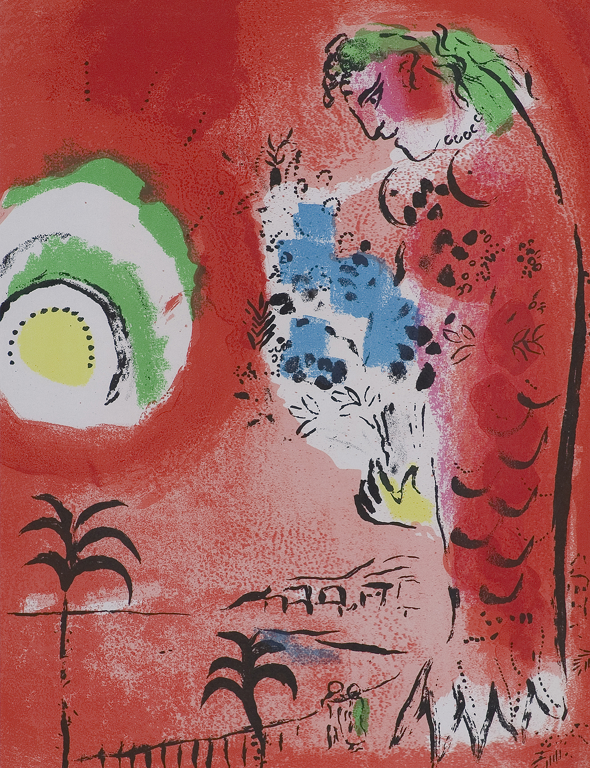 Marc Chagall uczył się rysunku u witebskiego malarza nazwiskiem Juda Pen, następnie od 1907 studiował w Akademii petersburskiej. W 1910 wyjechał na stypendium do Paryża. Zamieszkał w La Ruche na Montparnassie, wszedł do kręgu artystów, wśród których byli m.in. Modigliani, Soutine, Delaunay. W 1914 wrócił do Witebska, w 1915 poślubił Bellę (zm. 1944), muzę i bohaterkę wielu obrazów. W latach 1915-1917 mieszkał w Sankt Petersburgu, gdzie zastała go rewolucja. Mianowany komisarzem sztuk pięknych na obszar Witebska, założył tam i prowadził w latach 1918-1919 szkołę artystyczną, której profesorami byli m.in. Kazimierz Malewicz i El Lissitzky. W 1919 przeniósł się do Moskwy, gdzie do 1922 był kierownikiem artystycznym Państwowego Teatru Żydowskiego. W 1923 ostatecznie opuścił Rosję, osiedlając się w Paryżu. We Francji spędził resztę życia, z przerwą w latach 1941-1947, kiedy to schronił się w Nowym Jorku. Jego styl, wykształcony w młodości niezależnie od równoległych kierunków w sztuce, pozostał w ciągu życia artysty mało zmieniony. Wyobraźnia i sposób obrazowania Chagalla, zbliżone do sztuki naiwnej, wpisały się najsilniej w nurt surrealizmu, stając się jego znaczącym rozszerzeniem. Chagall łączył poetyckość i cudowność swych fantazji z rozwiniętym warsztatem malarza-kolorysty. Był też utalentowanym i płodnym grafikiem (cykle ilustracji do "Martwych dusz" Gogola, 1923-1927, "Bajek" La Fontaine’a, 1927-1930, Biblii, 1931-1955 – każdy cykl liczył ponad 100 plansz w technikach metalowych). Zajmował się scenografią (projekty dla Metropolitan Opera w Nowym Jorku, 1945, Opery w Paryżu, 1958), malarstwem monumentalnym (plafon w Operze paryskiej, 1963-1964), projektował witraże, dekoracje ceramiczne.