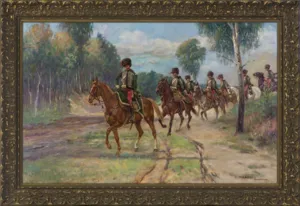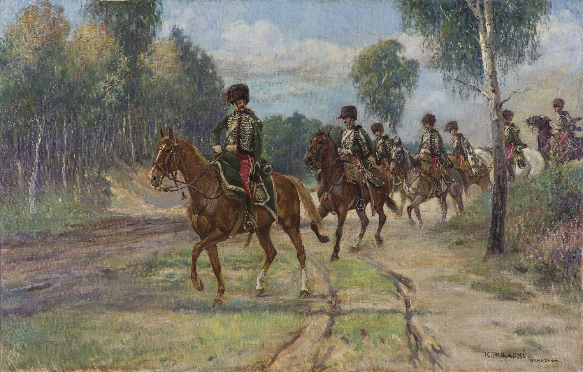 Kazimierz Pułaski - malarz batalista, cioteczny brat Wojciecha Kossaka. Studiował malarstwo w Monachium (1894), a później przez kilka lat mieszkał w Berlinie, gdzie miał wspólną pracownię z Kossakiem, pomagając mu przy malowaniu panoramy Berezyna. W roku 1900/1901, już w Warszawie pracował też przy panoramie Bitwy pod piramidami. W latach późniejszych nadal współpracował z Kossakiem i często podmalowywał tła do jego obrazów. We własnej twórczości nawiązywał do dzieł sławnego kuzyna malując, m.in. Huzarów, Szaserów, Kirasjerów, Rekonesanse, Pikiety czy Potyczki.