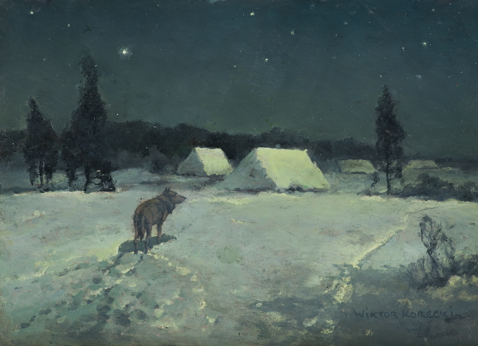 Wiktor Korecki (Kamieniec Podolski 1890 - Komorów k. Warszawy 1980) - malarz pejzażysta - gimnazjum ukończył w Kijowie, tam też studiował w Szkole Rysunkowej Aleksandra Muraszki. Po studiach wrócił do Kamieńca Podolskiego, skąd w roku 1921 wyjechał do Warszawy. Tu miał pracownię na rogu ulic Tamki i Cichej. Niestety zgromadzone tam obrazy spłonęły w czasie powstania 1944 roku. Po powstaniu artysta przebywał w obozie w Pruszkowie skąd trafił do obozu pracy w Lipsku. Do kraju powrócił w roku 1946 i zamieszkał w Komorowie pod Warszawą, a później w Milanówku. Jego nastrojowe krajobrazy emanujące spokojem i pogodą cieszyły się zawsze dużą popularnością. Korecki najczęściej malował pejzaże zimowe z motywem leśnej drogi i strumienia wijącego się wśród śniegów, a obok nich także wiosenne, letnie czy jesienne widoki z Mazowsza.