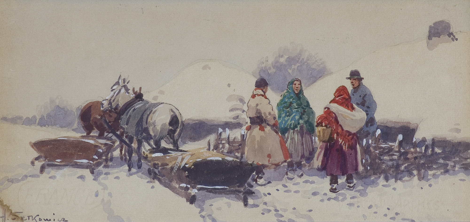 Adam Setkowicz (Kraków 1876 - Kraków 1945) to popularny malarz scen rodzajowych z zaprzęgami, polowaniami, saniami i śniegami, malowanych akwarelą bądź olejno, w których wyraźnie nawiązywał do prac A. Wierusza-Kowalskiego, J. Brandta czy też J. Fałata. O życiu artysty wiadomo jednak niewiele poza tym, że w latach 1891-1894 kształcił się w krakowskiej Szkole Sztuk Pięknych, gdzie w 1897/1898 kontynuował studia pod kierunkiem Teodora Axentowicza. W 1933 wziął udział w wystawie w Piotrkowie Trybunalskim.