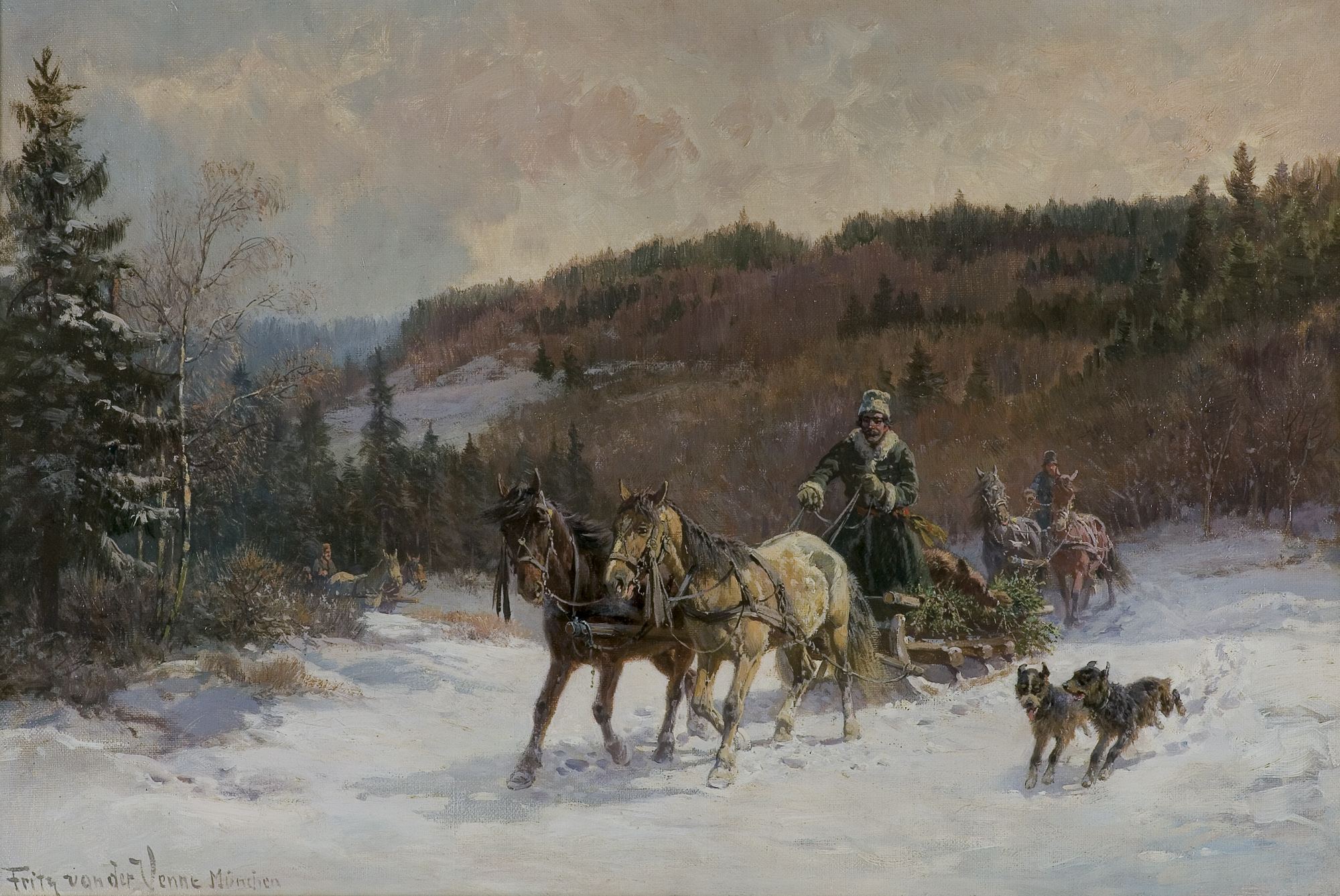 Fritz van der Venne - popularny malarz czynny w Monachium. Ulubionym motywem jego obrazów były konie, które przedstawiał w rodzajowo ujętych scenach na tle, najczęściej zimowego, krajobrazu. Malował zaprzęgi, powozy, sanny, wyjazdy i powroty z polowań, sceny z węgierskiej puszty, a nawet konne, „polskie“ korowody weselne.