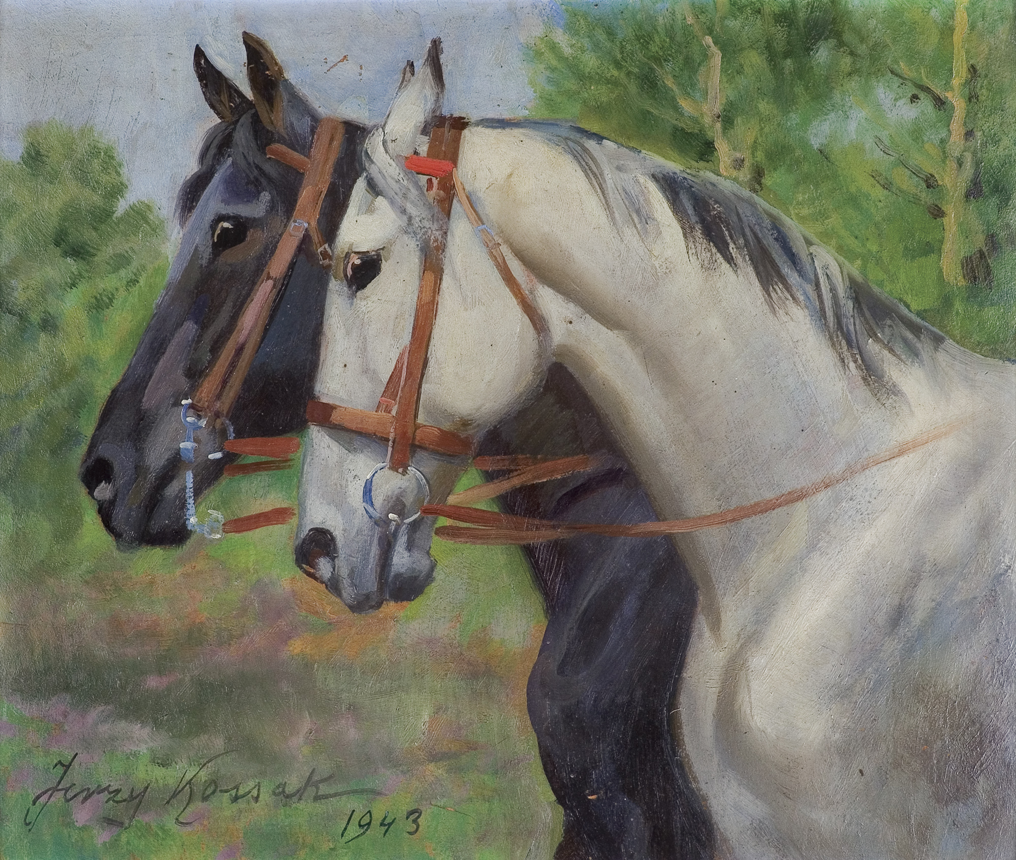 Jerzy Kossak (Kraków 1886 - Kraków 1955)- syn Wojciecha, wnuk Juliusza Kossaków - od wczesnego dzieciństwa malował pod kierunkiem ojca i dziadka. Kontynuator i naśladowca ich sztuki tworzył sceny batalistyczne, historyczne i rodzajowe z wszechobecnym motywem konia. Malował obrazy z powstania listopadowego, wojen napoleońskich oraz wiele scen z wojny 1920 roku. Najbardziej znaną jego kompozycją tego rodzaju był Cud nad Wisłą. Malował też liczne Pogonie i Pościgi ułanów za kozakami, Napady wilków, Polowania i Wesela. Tematyka tych prac sprawia, że stale cieszą się zainteresowaniem zbieraczy i publiczności, zawsze tłumnie odwiedzającej wystawy malarstwa Kossaków.