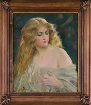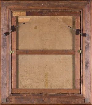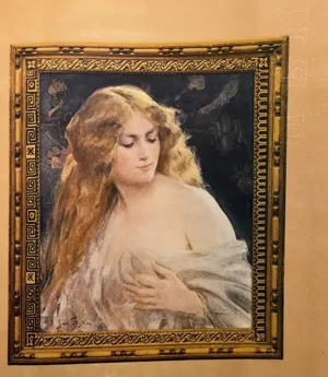 Na odwrocie, na płótnie pośrodku, owalny, trudno czytelny stempel francuskiej firmy z materiałami malarskimi; u góry po lewej nalepka z napisem (atramentem): Calypso à la belle chevelure.