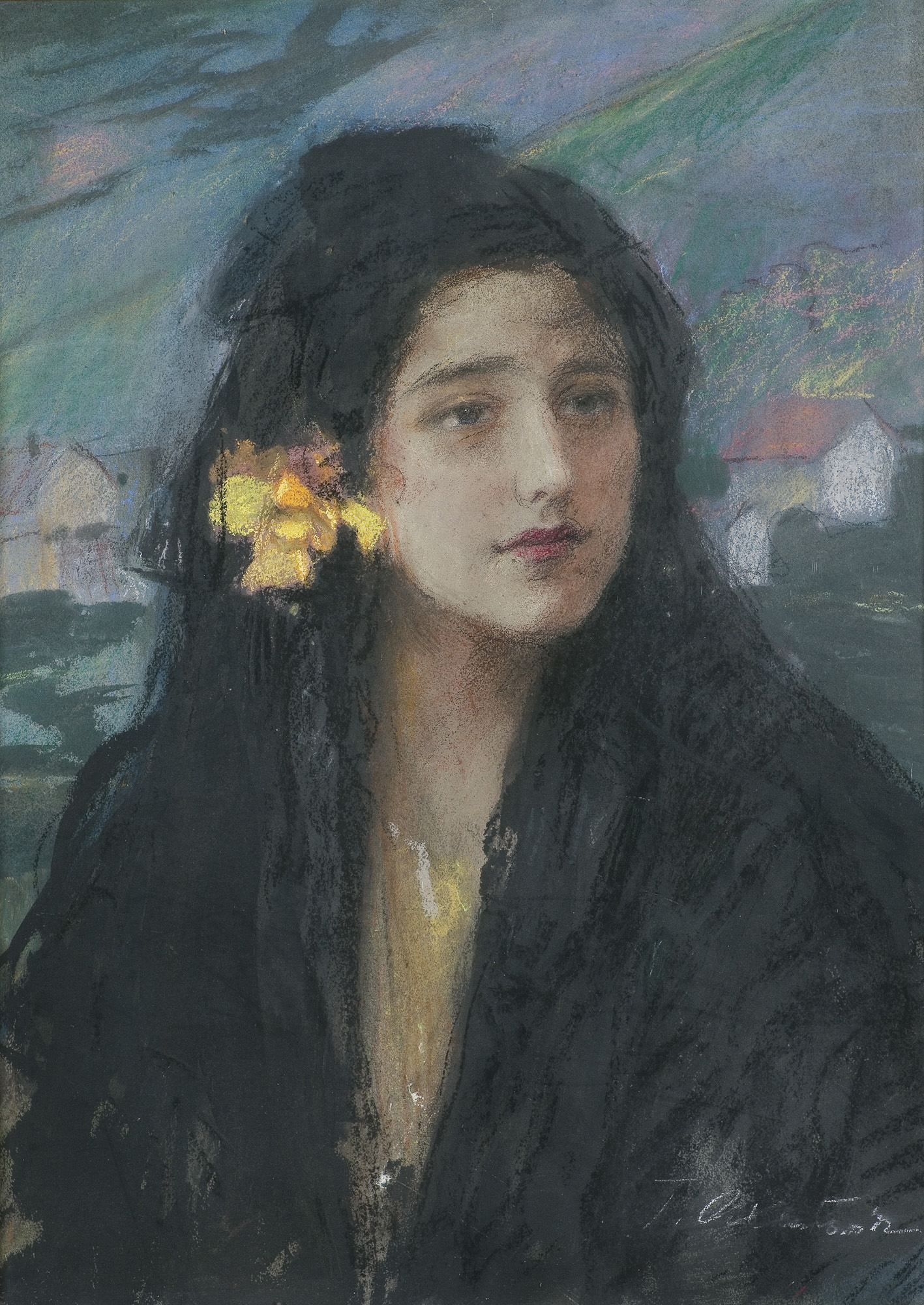 Teodor Axentowicz (Braszów w Siedmiogrodzie 1859 - Kraków 1938) – malarz, pastelista, litograf – był jednym z najbardziej znanych i cenionych malarzy polskich. Kształcił się w Akademii Sztuk Pięknych w Monachium pod kierunkiem Gabriela Hackla, Aleksandra Wagnera, Gyuli Benczúra. Studia uzupełniał w Paryżu, gdzie następnie przebywał przez lat kilkanaście. Brał udział w paryskich Salonach; w 1890 otrzymał członkostwo Société Nationale des Beaux-Arts. W tym czasie wielokrotnie wyjeżdżał również do Londynu. W 1895 powrócił do kraju i zamieszkał na stałe w Krakowie, powołany na profesora tamtejszej Szkoły Sztuk Pięknych (od 1900 Akademii). W uczelni tej nauczał nieprzerwanie do 1934, dwukrotnie pełniąc funkcję rektora (lata 1910-11 oraz 1927-28). Był jednym z członków-założycieli Towarzystwa Artystów Polskich „Sztuka”, członkiem wiedeńskiej „Secesji” i współpracownikiem jej pisma „Ver Sacrum”. Powodzenie przyniosły mu zwłaszcza idealizowane wizerunki wytwornych dam oraz wdzięczne portrety dziecięce. Malował też obrazy o tematyce rodzajowej; był jednym z pierwszych malarzy Huculszczyzny i Hucułów. Tworzył obrazy historyczne i kompozycje symboliczne związane z upływem czasu, przemijaniem, starością. We wczesnym, monachijskim okresie były to obrazy utrzymane w duchu akademickiego realizmu; na późniejszą twórczość artysty wywarło wpływ angielskie malarstwo XVIII w. oraz dzieła malarzy współczesnych - Boldoniego, Whistlera, Sargenta. Jego obrazy cechuje dekoracyjność, elegancja, świeżość subtelnej gamy kolorów i delikatna secesyjna stylizacja. Początkowo malował olejno i akwarelą, a po 1890 przede wszystkim mistrzowsko opanowaną techniką pastelu. Zajmował się ilustratorstwem i litografią, projektował plakaty wystaw „Sztuki”.