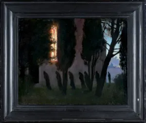 Edward Okuń (Wólka Zerzyńska /obecnie Zerzeńska/ k. Warszawy 1872 - Skierniewice 1945) – malarz, rysownik, ilustrator – studia artystyczne rozpoczął w warszawskiej Klasie Rysunkowej u Wojciecha Gersona. W latach 1891-1893 kształcił się w krakowskiej Szkole Sztuk Pięknych, m.in. u Jana Matejki, od 1893 w Monachium u Antona Ažbe, Stanisława Grocholskiego i Szymona Hollosy’ego. Studia uzupełniał w Paryżu. Od roku 1898 stale mieszkał we Włoszech – w Rzymie, a okresowo także w pobliskim Anticoli Corrado, we Florencji, Sorrento, Amalfi i na Capri. W 1914 podróżował do Egiptu. W roku 1921 wrócił do Warszawy, gdzie w latach 1925-1930 był profesorem Szkoły Sztuk Pięknych. Jeszcze kilkakrotnie wyjeżdżał do Włoch (m.in. w 1928, 1937, 1938), a w latach 1927 oraz 1929-1932 jeździł do Jugosławii, gdzie powstał cykl pejzaży Znad Adriatyku - "Jadran". Malował dekoracyjne, stylizowane portrety, idylliczne pejzaże i kompozycje o wątkach fantastycznych i baśniowych, bliskie symbolizmowi i secesji. Często sam projektował ramy do swoich obrazów, traktując je jako integralną część tych dzieł. Był wybitnym twórcą grafiki książkowej; wykonywał ilustracje, winiety, projekty okładek, inicjały i przerywniki, współpracując m.in. z warszawskim pismem „Chimera”.