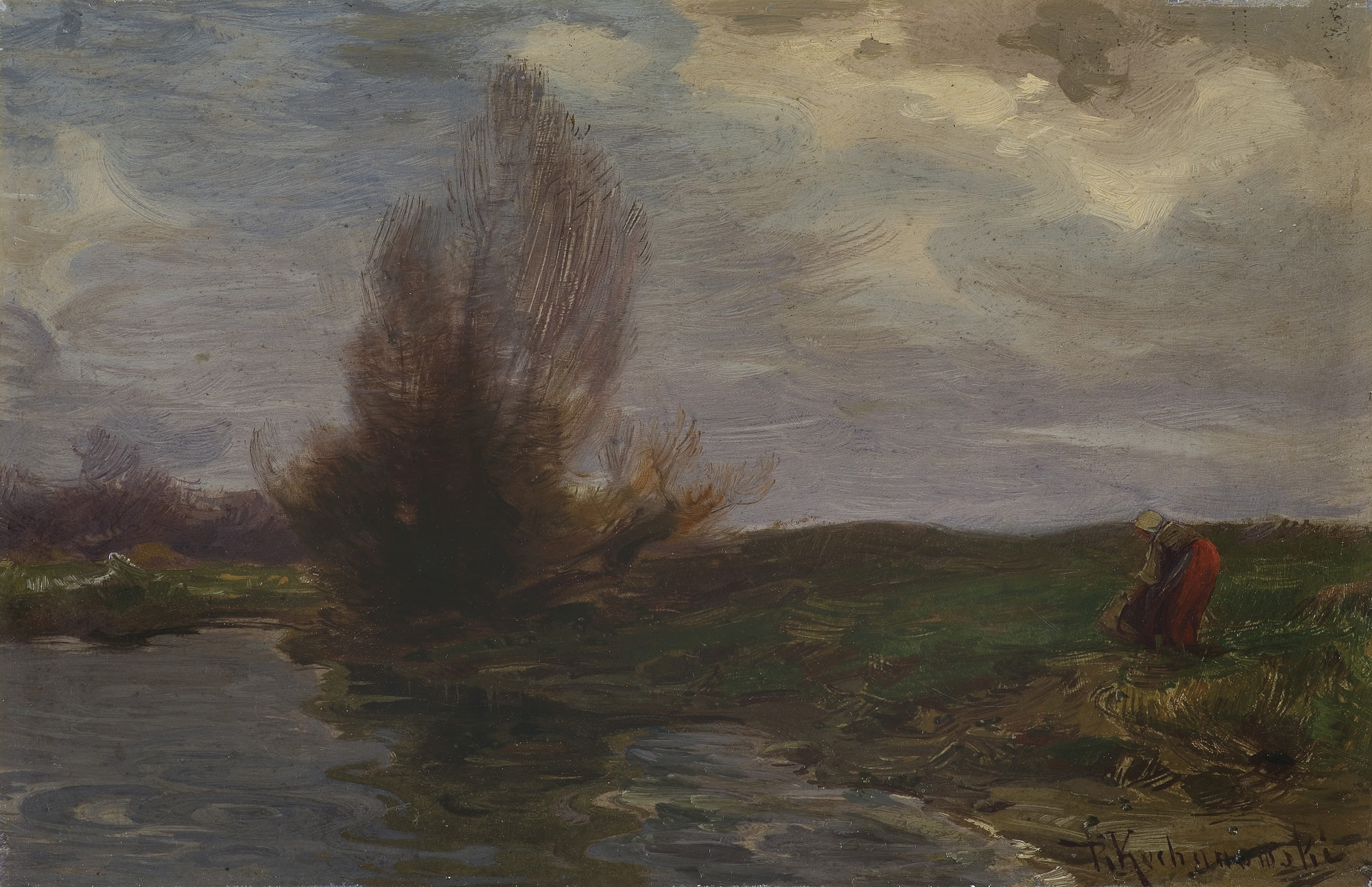 Roman Kochanowski (Kraków 1857 - Freising k. Monachium 1945) - malarz i grafik - był jednym z polskich artystów osiadłych i stałe działających w Monachium. Studia malarskie rozpoczął w Krakowie; początkowo w prywatnej pracowni Maksymiliana Cercha, a w latach 1873- 1875 w Szkole Sztuk Pięknych u Władysława Łuszczkiewicza i pejzażysty Henryka Grabińskiego. Przez następne dwa lata uczył się jeszcze na wydziale pejzażu w Akademii wiedeńskiej. W 1881 przeniósł się do Monachium, gdzie miał własną pracownię, a niebawem założył rodzinę. Często jednak przyjeżdżał do Krakowa, bywał w Poznańskiem, odbył podróż po Galicji i Podolu, rysując krajobrazy i widoki miast, które weszły następnie do albumu wydanego w Wiedniu w roku 1898. Artysta należał do monachijskiego Kunstvereinu, brał udział w wielu wystawach w Niemczech, w Wiedniu, w Londynie; swoje prace przesyłał też na pokazy krajowe. Malował przede wszystkim pejzaże a tylko z rzadka kwiaty i portrety. Stałym i ulubionym motywem jego obrazów był polski, podkrakowski krajobraz z wplecionymi weń postaciami ludzi. Obrazy artysty, malowane często na niewielkich deseczkach, pozbawione warstwy anegdotycznej odznaczają się niecodziennymi walorami malarskimi, harmonią koloru i pełnym liryzmu nastrojem. Zauważane i nagradzane na licznych wystawach były też wysoko cenione na rynku sztuki. W roku 1892, po wystawie w Wiedniu, jeden z obrazów Kochanowskiego zakupił do swoich zbiorów cesarz Franciszek Józef; dwa inne nabyli członkowie cesarskiej rodziny. Wielbicielem jego malarstwa był Karol Józef Luitpold, książę regent Bawarii. Wielka wrażliwość artysty na krajobraz i przyrodę widoczna jest także w jego rysunkach i akwafortach.