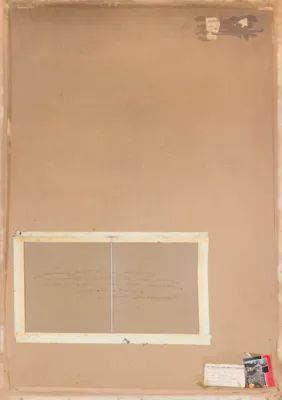 P.g. i l.d. dwie nalepki, górna zachowana fragmentarycznie (druk, niebieski długopis): TOW. PRZYJACIÓŁ SZTUK PIĘKNYCH W KRAKOWIE | Autor Jacek Malczewski | Tytuł dzieła Śmierć II | Rodzaj dzieła ol.-tekt. 97 x 67 | Cena | Podpis autora p. Ziembickiej; obok wycinek prasowy z...