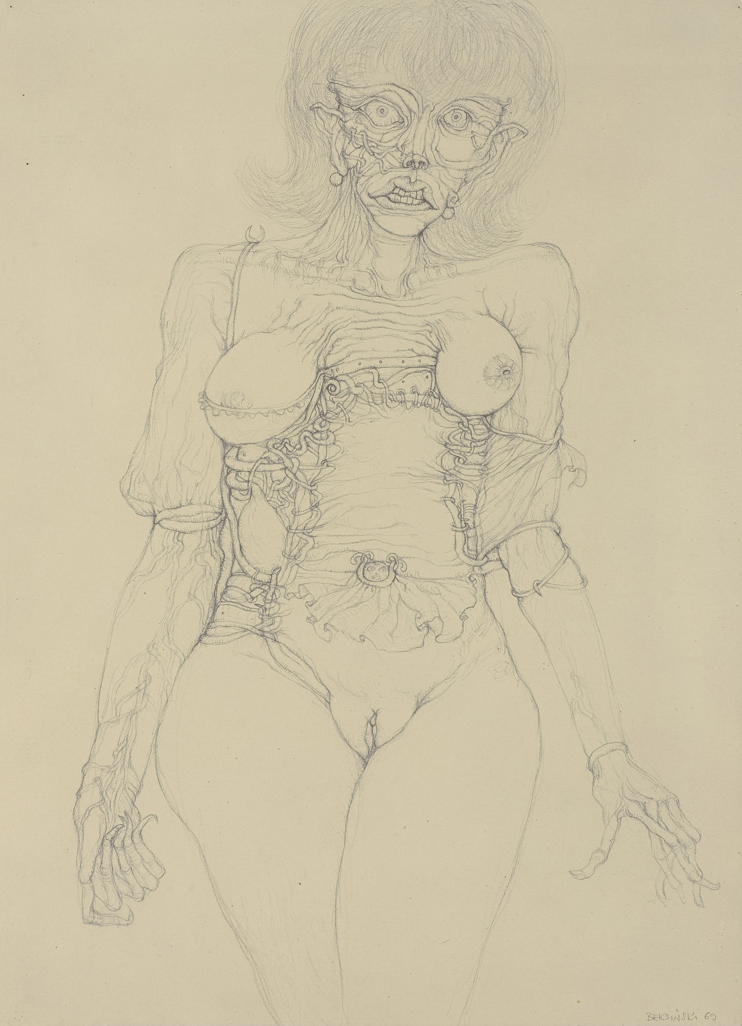 Zdzisław Beksiński (Sanok 24 II 1929 - Warszawa 21 II 2005) studiował w latach 1947-1952 na Wydziale Architektury Politechniki Krakowskiej. Był artystą samoukiem, który osiągnął niekwestionowaną pozycję w polskiej sztuce współczesnej, potwierdzoną obecnością jego prac na prestiżowych wystawach i w kolekcjach muzealnych. Początkowo zajmował się fotografią, którą interesował się od lat studenckich, po 1956 zyskując uznanie jako twórca fotogramów o estetyce opartej o efekty fakturowe. W latach 1958-1962 tworzył abstrakcyjne obrazy-reliefy o bogatej fakturze, głównie metalowe, będące odmianą malarstwa materii. Pod koniec tego okresu powstawały ażurowe formy o kształtach figur i pełnoplastyczne rzeźby w metalu. Kolejnym etapem jego twórczości były lata 1962-1974, kiedy poświęcał się głównie rysunkowi. W latach 60. rysował piórkiem i tuszem figuralne kompozycje odznaczające się karykaturalną deformacją postaci. Od końca lat 60. tworzył rysunki węglem i kredkami, będące monochromatyczną odmianą jego równoległej twórczości malarskiej. Od 1974 zajmował się niemal niepodzielnie malarstwem. Jego charakterystyczny styl bazował na perfekcji technicznej, której towarzyszyła niezwykłość wizji. Malował świat po katastrofie, naznaczony piętnem śmierci i rozpadu. Jego obrazy zaludniają postaci i stwory o ludzkich wprawdzie bądź zwierzęcych kształtach, lecz o cechach fantomów, automatów lub rozpadających się trucheł. Artysta nie nadawał swym obrazom i rysunkom tytułów (poza porządkującymi symbolami), akcentując w ten sposób swój brak zainteresowania dla literackiej strony przedstawień. Sam mówił, że malując całkowicie poddaje się wizji, „fotografuje“ ją. W ostatnich latach włączył do swego warsztatu artystycznego elektroniczne techniki generowania obrazu, które wykorzystywał do tworzenia komputerowych fotomontaży. Sztuka Beksińskiego, wielokrotnie wystawiana i omawiana, budzi skrajne emocje wśród znawców i publiczności.