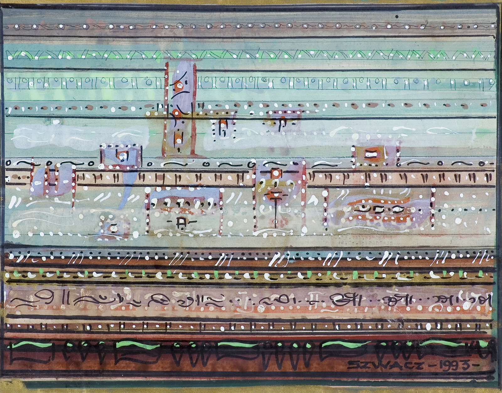 Bogusław Szwacz (Leżajsk 27 III 1912 – Warszawa 24 II 2009) studiował malarstwo na ASP w Krakowie, którą ukończył z wyróżnieniem w 1937. W czasie studiów odbył służbę w Szkole Podchorążych Rezerwy na kresach oraz podróż studyjną do Wiednia. Lata wojny przetrwał we Lwowie, kolejno pod okupacją sowiecką i niemiecką. W 1944 ewakuowany z Niemcami do Krakowa, osiadł w Tyńcu, gdzie powstał cykl pejzażowych akwarel. Po wojnie włączył się w organizowanie życia artystycznego, w 1946 podjął pracę pedagogiczną w krakowskiej ASP. W 1946 wystawiał z Grupą Młodych Plastyków Kantora. W 1947/48 wyjechał na stypendium do Paryża, gdzie przystąpił do grupy „Le Surréalisme Révolutionnaire", współredagował jej dwumiesięcznik. W 1948 przeniósł się do Warszawy, gdzie związał się z Klubem Młodych Artystów i Naukowców. Okres działalności w ruchu awangardy powojennej zamknął udziałem w I Wystawie Sztuki Nowoczesnej w Krakowie na przełomie 1948/49. Od końca 1949 pracował w warszawskiej PWSSP, a po jej połączeniu się z ASP w 1950 rozpoczął wieloletnią karierę pedagogiczną w tej uczelni, trwającą do emerytury w 1982. W latach socrealizmu uczestniczył we wszystkich Ogólnopolskich Wystawach Plastyki (1950, 1951/52, 1952/53, 1954) i w innych oficjalnych wystawach. Jego wystawa indywidualna w marcu 1955 była jedną z pierwszych wystaw sztuki abstrakcyjnej. W tym czasie artysta zaczął formułować własną teorię sztuki, której pozostaje wierny do dziś. Koncepcja Ars-Horme (Sztuki Poruszania Wyobraźni) konkretyzuje się w obrazach, których odmiany określają terminy ars-hormegram, ars-hormegraf i ars-hormegryf. Są to kompozycje budowane z drobnych form, których rytmy i zagęszczenia na płaszczyźnie są dodatkowo akcentowane fakturą i kolorem. Teoria Ars-Horme stała też u podstaw metody dydaktycznej Szwacza, który od lat 60. uczył rysunku na Wydziale Rzeźby. Od końca lat 50. artysta uczestniczył w wielu wystawach ruchu awangardowego, m.in. w II i III Wystawie Sztuki Nowoczesnej w Warszawie (1957 i 1959), „Konfrontacjach“ w Galerii Krzywe Koło, Warszawa 1962 i 1963, I Biennale Form Przestrzennych w Elblągu (1965), sympozjach Złotego Grona w Zielonej Górze (1973, 1976), plenerach w Osiekach (1964, 1976, 1977, 1978, 1984). Oprócz malarstwa i rysunku artysta zajmował się muzyką (grał na skrzypcach), a od lat 80. również poezją (wybór z kilku tysięcy sonetów wydał w 1988 w dwu tomikach).