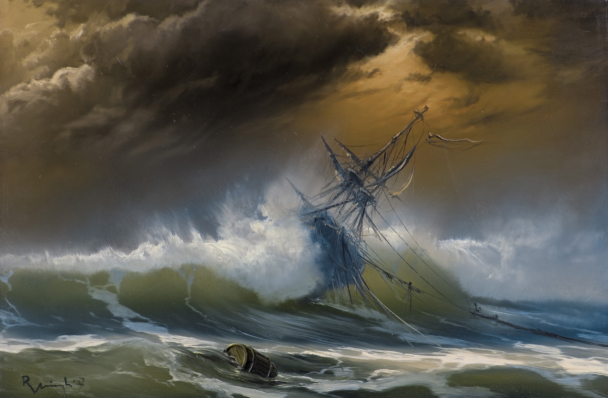Artysta natchniony pięknem morza i obrazami statków walczących z silnymi falami, często na tle dramatycznego nieba, kontynuuje tradycje malarstwa marynistycznego z okresu epoki romantyzmu.