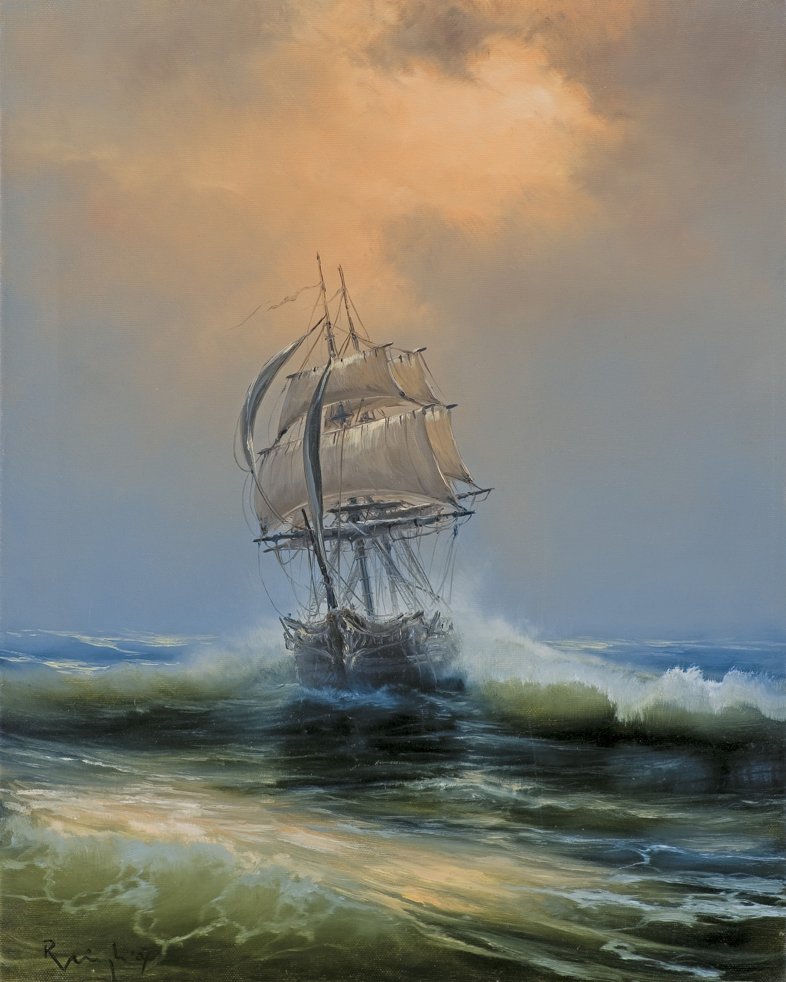 Artysta natchniony pięknem morza i obrazami statków walczących z silnymi falami, często na tle dramatycznego nieba, kontynuuje tradycje malarstwa marynistycznego z okresu epoki romantyzmu.
