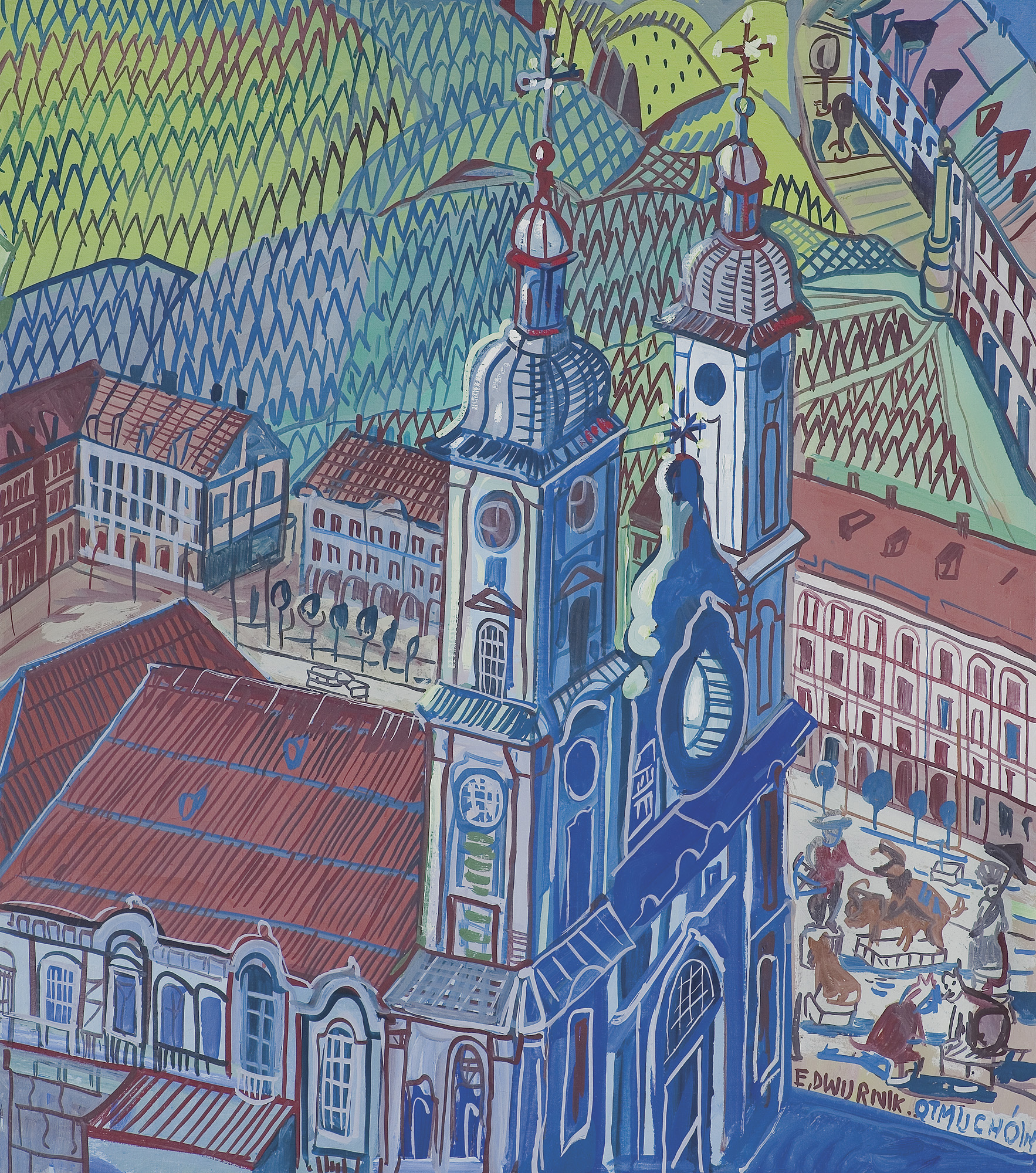 Edward Dwurnik (Radzymin 19 IV 1943 - Warszawa 28 X 2018) studiował malarstwo w ASP w Warszawie (1963-1970), jednak jako swego „mistrza“ wymienia Nikifora. Jego to prace, zobaczone po raz pierwszy w 1965, zainspirowały ówczesnego studenta III roku do narysowania pierwszych prac z cyklu „Podróże autostopem“, które kontynuował w nastepnych latach. W 1972-1978 powstawał cykl „Sportowcy“, w którym portretowane były, dodajmy - kąśliwie, typowe postaci z lat 70. Równolegle od 1975 powstawał cykl „Robotnicy“, który kulminował w okresie „Solidarności“ 1980-1981. Za prace z tego cyklu Dwurnik otrzymał w 1981 Nagrodę Krytyki Artystycznej im. Cypriana Kamila Norwida, natomiast za obrazy z cyklu „Warszawa“ (1981), proroczo zapowiadające stan wojenny - Nagrodę Kulturalną „Solidarności“ podziemnej w 1983. W latach 80. malarstwo Dwurnika przybrało wyraz ekspresyjny i dramatyczny. Powstające w tej dekadzie obrazy miały niejednokrotnie wymowę polityczną, przybierały też kostium historyczny, tak czy inaczej odnoszący się do współczesnych spraw i realiów. Cykl „Droga na Wschód“ (1989-91) upamiętniał ofiary stalinizmu, natomiast cykl „Od Grudnia do Czerwca“ (1990-94) - ofiary stanu wojennego. Zarówno ideowe, jak i czysto malarskie walory tych prac przyniosły artyście ogromne uznanie, zarówno w kraju jak i za granicą. Jego wyrazem była prestiżowa nagroda Fundacji Coutts & Co w Zurychu (1992). W latach 90. powstają cykle będące kontynuacją „Podróży autostopem“: „Niebieskie miasta“ (od 1993) i „Diagonale“ (od 1996), jak również kompozycje nowego typu, jak widoki morskie (cykl „Błękitne“, 1992-93) czy cykl „Wyliczanka“ (1996-99). Artysta wiele wystawia, miał ok. 100 wystaw indywidualnych w Polsce i za granicą, brał też udział w licznych wystawach i festiwalach krajowych i międzynarodowych, m.in.: X Biennale Sztuki Współczesnej, Menton 1974, Documenta 7, Kassel 1982, 5th Biennale, Sydney 1985, XIX Biennale Sztuki, Sao Paulo 1987; Olimpiada Sztuki, Seul 1988. Równolegle z malarstwem uprawiał rysunek, collage, grafikę warsztatową (litografia, techniki metalowe, kserografia, stemple) i użytkową (ilustracja, plakaty do własnych wystaw indywidualnych).