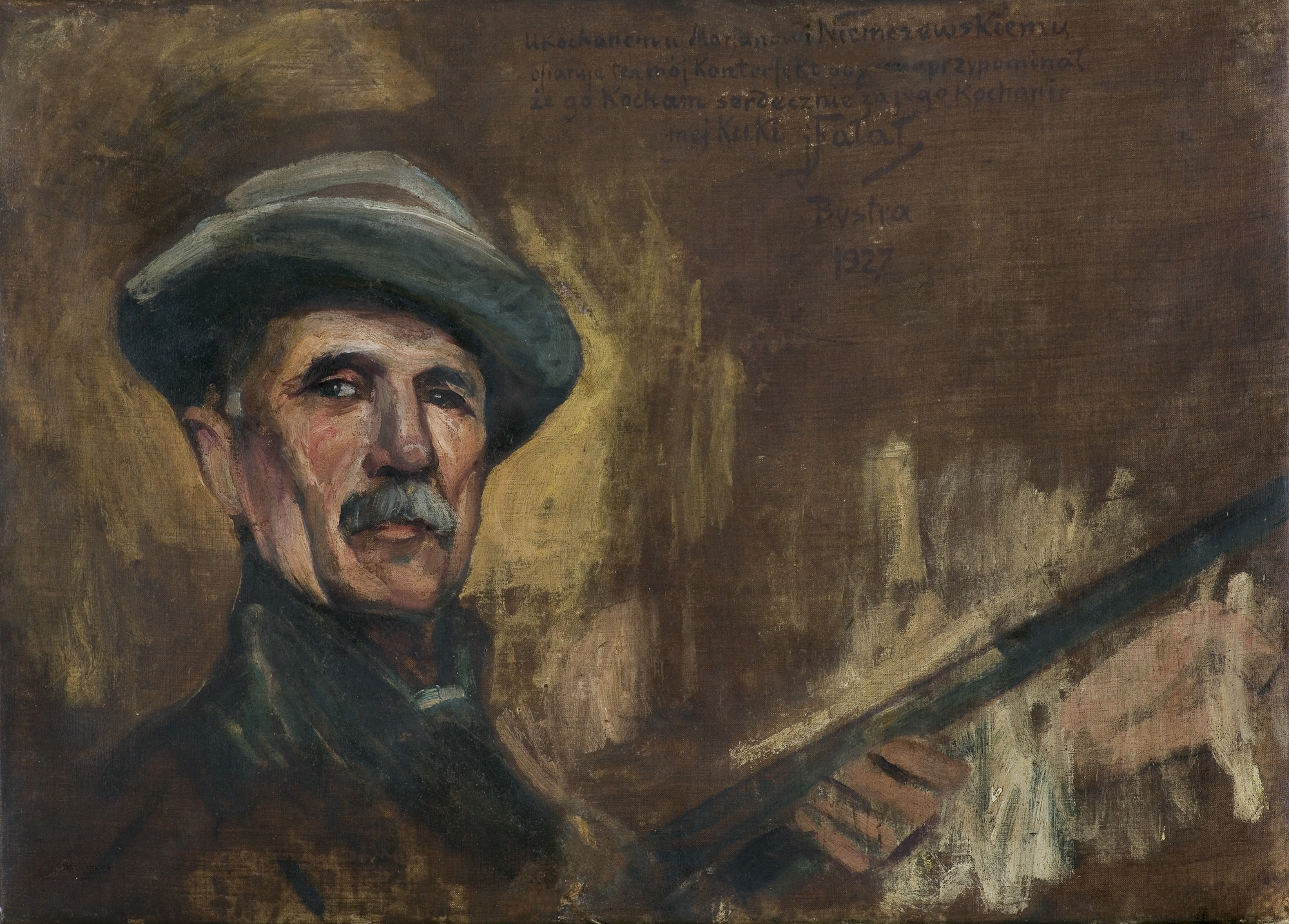 Julian Fałat (Tuligłowy [okręg lwowski] 1853 - Bystra k. Bielska 1929) - malarz i pedagog - jeden z najwybitniejszych artystów polskich okresu przełomu XIX i XX wieku, członek polskich i europejskich stowarzyszeń twórczych oraz Królewskiej Akademii Sztuk Pięknych w Berlinie, wielokrotnie odznaczany medalami na wystawach międzynarodowych. Studiował malarstwo u Władysława Łuszczkiewicza i Leona Dembowskiego w Szkole Sztuk Pięknych w Krakowie (1868-71 i 1881) i w Akademii Sztuk Pięknych w Monachium u Alexandra Strähubera i Johana Leonhardta Raaba (1877-80). Po studiach spędził kilka miesięcy w Rzymie, w 1884 był w Paryżu i w Hiszpanii, a w 1885 odbył podróż morską dookoła świata. W 1886 podczas polowania u ks. Radziwiłłów w Nieświeżu poznał późniejszego cesarza Niemiec Wilhelma II - dla którego następnie w latach 1886-95 pracował w Berlinie jako malarz nadworny. W latach 1894-96 współpracował z Wojciechem Kossakiem przy panoramie Berezyna. W 1895 został powołany na stanowisko dyrektora Szkoły Sztuk Pięknych w Krakowie, w której gruntownie zreformował system nauczania, przekształcając tę uczelnię w nowoczesną Akademię Sztuk Pięknych (r.1900). Do roku 1910 był rektorem Akademii; po przejściu na emeryturę osiadł w miejscowości Bystra k. Bielska. Znakomity akwarelista, malował także olejno. We wcześniejszym okresie tworzył w konwencji realistycznej, z czasem rozjaśnił i wzbogacił paletę, a w akwarelach wprowadzał rozlewną plamę barwną. Zasłynął jako malarz scen myśliwskich rozgrywających się najczęściej w zimowej scenerii; malował też pejzaże, wiejskie sceny rodzajowe, portrety, widoki miejskie.