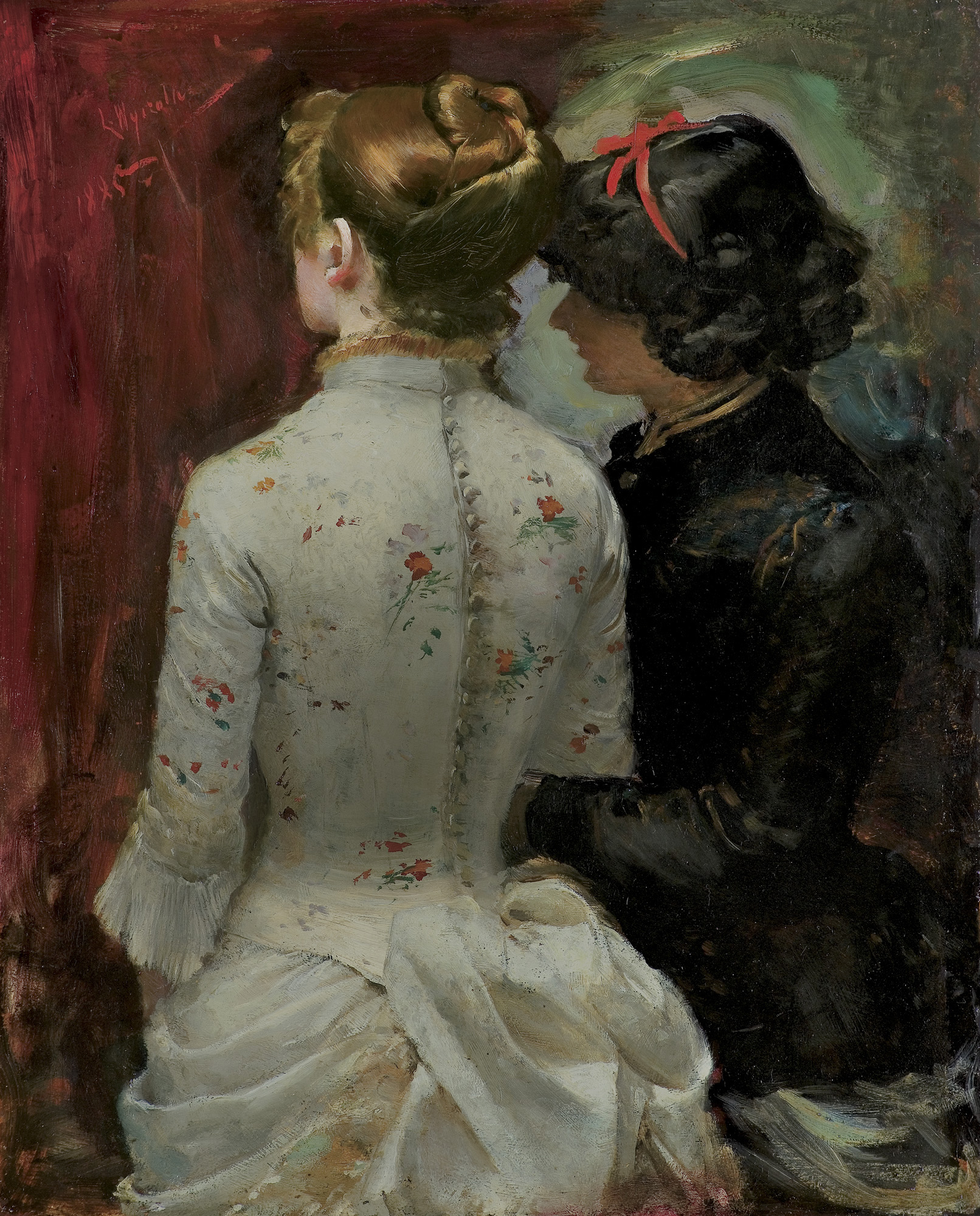 Choć tło zostało przez artystę rzucone prędko i swobodnie, to zapewnia ono pełną czytelność tej kompozycji. Stroje również potraktowane zostały z pewną impresją, a mimo to bez trudu możemy odczytać kwiatowy wzór na gorsecie białej sukni. Zarówno suknię, jak i modelkę możemy zaobserwować na obrazie Rozmowa z 1883 roku, niestety, jej usadowienie nie pozwala na jednoznaczną identyfikację kobiety.