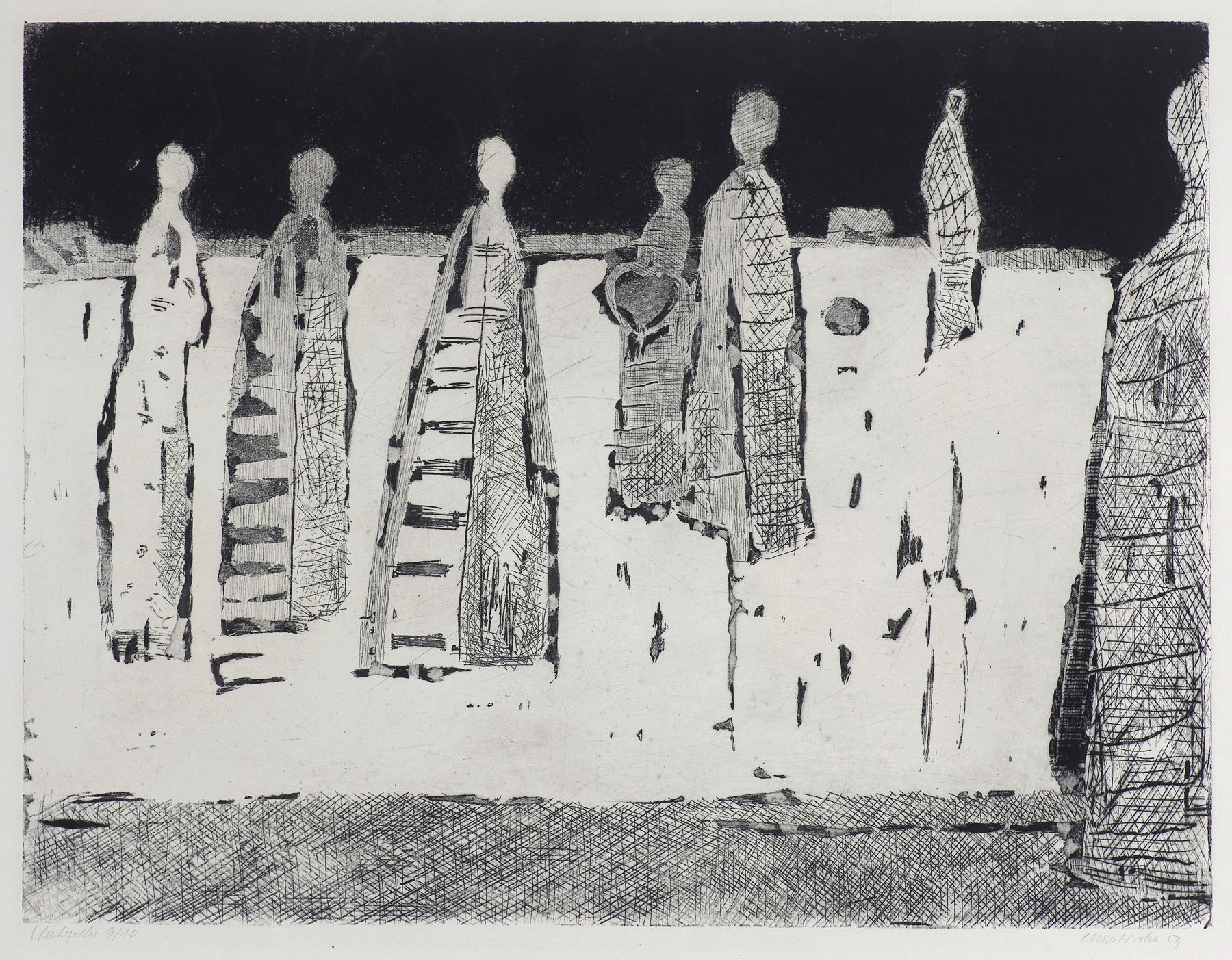 Halina Chrostowska (Warszawa 1929- Warszawa 1990) - pobierała pierwsze nauki pod okiem ojca, Stanisława Ostoja-Chrostowskiego, wybitnego grafika okresu międzywojennego i pierwszego rektora warszawskiej ASP po wojnie. Studiowała malarstwo i grafikę w latach 1946-1950 w tej uczelni. W 1950 rozpoczęła pracę pedagogiczną na Wydziale Grafiki, którą kontynuowała do 1989. Od 1962 prowadziła własną pracownię grafiki warsztatowej, w której wykształciła wielu wybitnych artystów. Równolegle działała w Związku Polskich Artystów Plastyków. Debiutowała w pierwszej połowie lat 50. cyklami akwafort, m. in. „W walce”, „Powstanie Kościuszkowskie”, „Z PGR-u”, nagradzanych na Ogólnopolskich Wystawach Plastyki (1952-1954). W 1955 zdobyła II nagrodę i srebrny medal na Międzynarodowym konkursie i wystawie towarzyszącym V Światowemu Festiwalowi Młodzieży i Studentów w Warszawie. Mimo dominacji doktryny socrealizmu, artystka potrafiła wypracować formułę realizmu dalekiego od polityki, refleksyjnego i wiernego nieupiększonym realiom tych lat. Od około 1956 w jej twórczości górę wzięło zainteresowanie eksperymentami formalnymi i technicznymi. Początkowo tworzyła grafiki czarno-białe, skupiając się na efektach fakturowych (cykle „Astralny” (1957), „Komedianci”, 1961-1963). Łączyła niekiedy matryce metalowe z linorytniczymi i drzeworytniczymi. W 1968 wprowadziła do swych prac kolor, tworząc serie „Portretów” i różnobarwnych „Figur”. Grafiki Chrostowskiej łączyły związki z równoległymi nurtami malarstwa informel, w latach 70. z pop-artem. Od końca lat 50. datują się największe sukcesy artystki na forum krajowym i międzynarodowym. Uczestniczyła m. in. w I Biennale Młodych, Paryż 1959, II Międzynarodowym Biennale Grafiki, Tokio 1960 (gdzie uzyskała nagrodę Muzeum Ohara), VI Biennale Sztuki, Săo Paulo 1961, II Międzynarodowe Biennale Grafiki, Florencja 1970 (złoty medal). Kryzys zdrowotny (nadwerężenie nadgarstków) w 1973 zmusił ją do przejściowego zaniechania forsownej pracy przy grafice. Powstał wtedy rysunkowy cykl „Ręce”, w którym artystka odbijała swe dłonie pokryte farbami. Od 1975 wróciła do grafiki, tworząc kolejne kompozycje z zarzuconych cyklów. Od 1977 wykonywała unikatowe odbitki łączące grafikę z malarstwem i collage'em. W 1986 zapadła na chorobę nowotworową. Od 1988 wprowadziła do swego warsztatu sitodruk i kontynuowała eksperymenty malarskie.