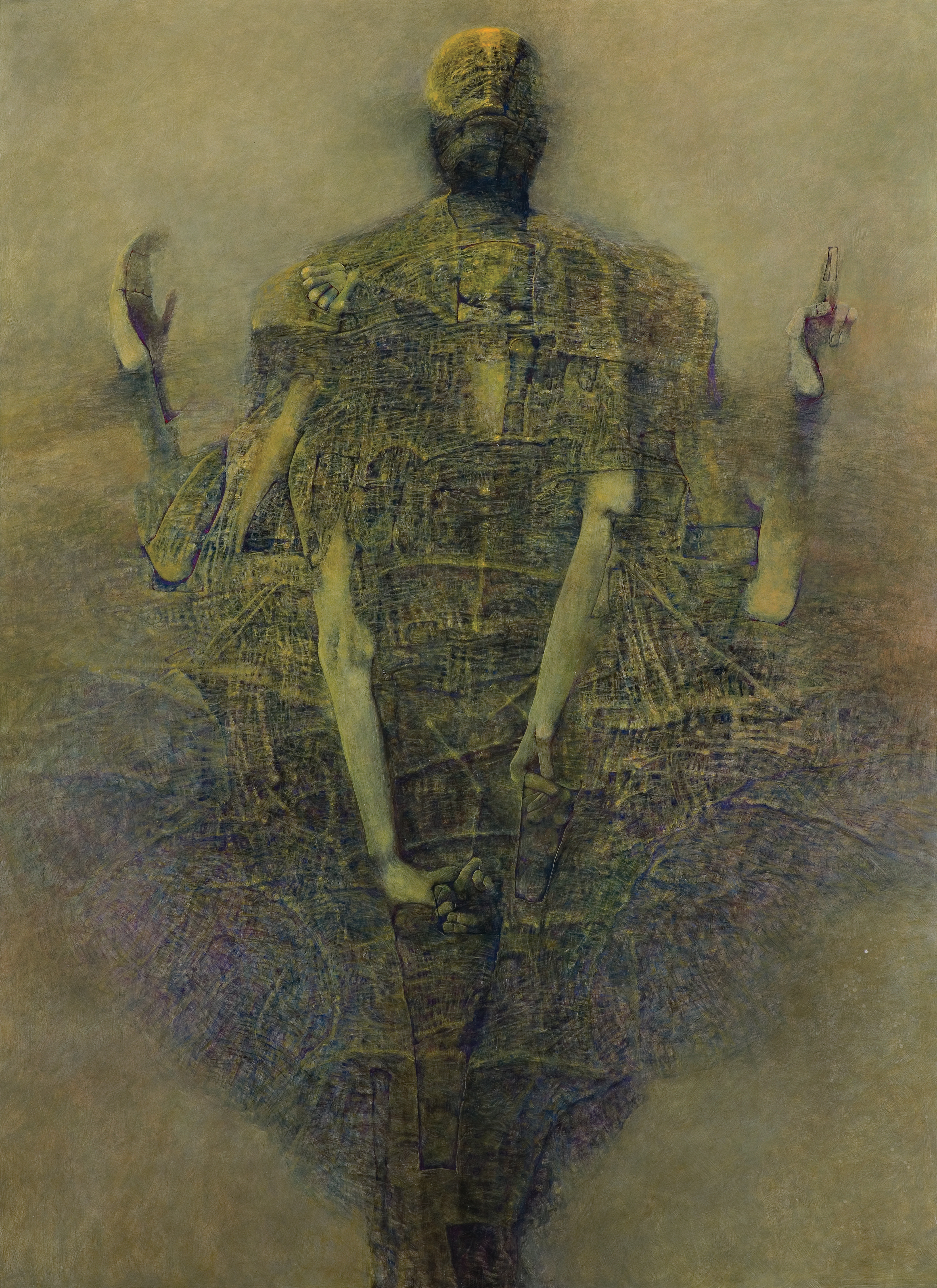 Zdzisław Beksiński (Sanok 24 II 1929 - Warszawa 21 II 2005) studiował w latach 1947-1952 na Wydziale Architektury Politechniki Krakowskiej. Był artystą samoukiem, który osiągnął niekwestionowaną pozycję w polskiej sztuce współczesnej, potwierdzoną obecnością jego prac na prestiżowych wystawach i w kolekcjach muzealnych. Początkowo zajmował się fotografią, którą interesował się od lat studenckich, po 1956 zyskując uznanie jako twórca fotogramów o estetyce opartej o efekty fakturowe. W latach 1958-1962 tworzył abstrakcyjne obrazy-reliefy o bogatej fakturze, głównie metalowe, będące odmianą malarstwa materii. Pod koniec tego okresu powstawały ażurowe formy o kształtach figur i pełnoplastyczne rzeźby w metalu. Kolejnym etapem jego twórczości były lata 1962-1974, kiedy poświęcał się głównie rysunkowi. W latach 60. rysował piórkiem i tuszem figuralne kompozycje odznaczające się karykaturalną deformacją postaci. Od końca lat 60. tworzył rysunki węglem i kredkami, będące monochromatyczną odmianą jego równoległej twórczości malarskiej. Od 1974 zajmował się niemal niepodzielnie malarstwem. Jego charakterystyczny styl bazował na perfekcji technicznej, której towarzyszyła niezwykłość wizji. Malował świat po katastrofie, naznaczony piętnem śmierci i rozpadu. Jego obrazy zaludniają postaci i stwory o ludzkich wprawdzie bądź zwierzęcych kształtach, lecz o cechach fantomów, automatów lub rozpadających się trucheł. Artysta nie nadawał swym obrazom i rysunkom tytułów (poza porządkującymi symbolami), akcentując w ten sposób swój brak zainteresowania dla literackiej strony przedstawień. Sam mówił, że malując całkowicie poddaje się wizji, „fotografuje“ ją. W ostatnich latach włączył do swego warsztatu artystycznego elektroniczne techniki generowania obrazu, które wykorzystywał do tworzenia komputerowych fotomontaży. Sztuka Beksińskiego, wielokrotnie wystawiana i omawiana, budzi skrajne emocje wśród znawców i publiczności.