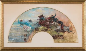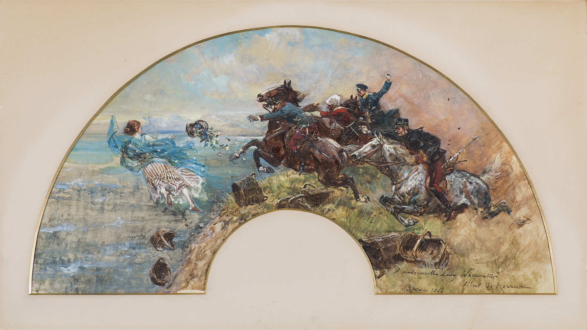 Wojciech Kossak (Paryż 1856 - Kraków 1942 ) – powszechnie znany malarz, postrzegany przede wszystkim jako świetny batalista. Syn i uczeń Juliusza Kossaka kształcił się w krakowskiej Szkole Sztuk Pięknych, w Akademii monachijskiej oraz w Paryżu. W latach 1895-1902 przebywał głównie w Berlinie, pracując dla cesarza Wilhelma II. Wiele podróżował, m.in. do Hiszpanii i Egiptu, gdzie wykonywał szkice do zamierzonych panoram. W późniejszych latach kilkakrotnie wyjeżdżał do Stanów Zjednoczonych wykonując zamówienia portretowe. W 1913 był mianowany profesorem warszawskiej Szkoły Sztuk Pięknych. W latach I wojny światowej pełnił służbę wojskową. Był współautorem panoram: „Racławice” (1893-1894), „Berezyna” (1895-1896), „Bitwa pod piramidami” (1901) oraz szkiców do niezrealizowanej „Somosierry” (1900). Z temperamentem i swobodą tworzył szeroko malowane, dynamiczne sceny batalistyczne, historyczne, rodzajowe oraz liczne portrety. Z upodobaniem malował konie. Jego obrazy, gloryfikujące dawne i współczesne artyście polskie wojsko i bohaterstwo żołnierzy, trafiały do patriotycznych uczuć odbiorców i cieszyły się ogromna popularnością.