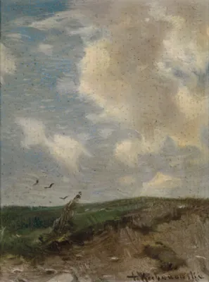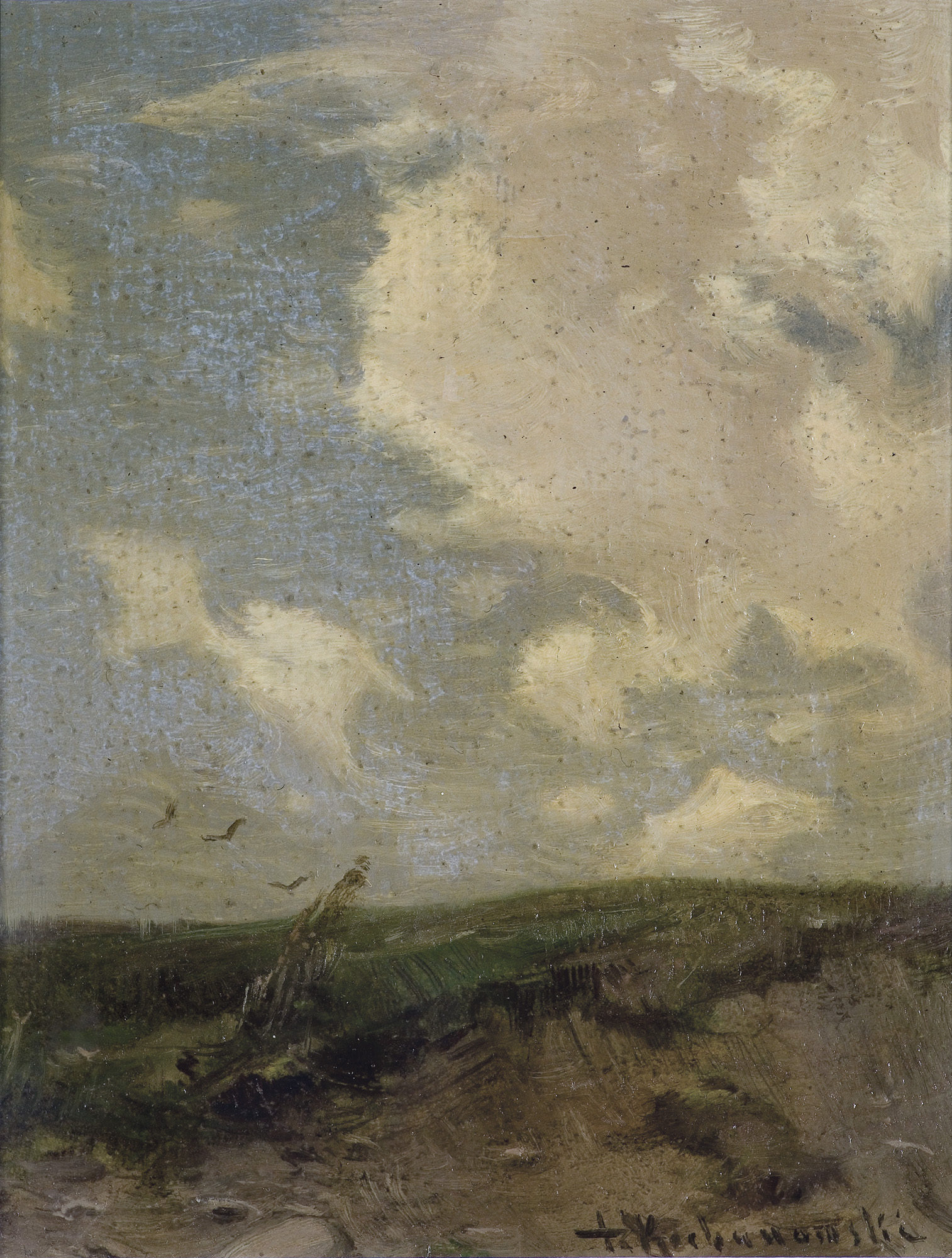 Roman Kochanowski (Kraków 1857 - Freising k. Monachium 1945) - malarz i grafik - był jednym z polskich artystów osiadłych i stałe działających w Monachium. Studia malarskie rozpoczął w Krakowie; początkowo w prywatnej pracowni Maksymiliana Cercha, a w latach 1873- 1875 w Szkole Sztuk Pięknych u Władysława Łuszczkiewicza i pejzażysty Henryka Grabińskiego. Przez następne dwa lata uczył się jeszcze na wydziale pejzażu w Akademii wiedeńskiej. W 1881 przeniósł się do Monachium, gdzie miał własną pracownię, a niebawem założył rodzinę. Często jednak przyjeżdżał do Krakowa, bywał w Poznańskiem, odbył podróż po Galicji i Podolu, rysując krajobrazy i widoki miast, które weszły następnie do albumu wydanego w Wiedniu w roku 1898. Artysta należał do monachijskiego Kunstvereinu, brał udział w wielu wystawach w Niemczech, w Wiedniu, w Londynie; swoje prace przesyłał też na pokazy krajowe. Malował przede wszystkim pejzaże a tylko z rzadka kwiaty i portrety. Stałym i ulubionym motywem jego obrazów był polski, podkrakowski krajobraz z wplecionymi weń postaciami ludzi. Obrazy artysty, malowane często na niewielkich deseczkach, pozbawione warstwy anegdotycznej odznaczają się niecodziennymi walorami malarskimi, harmonią koloru i pełnym liryzmu nastrojem. Zauważane i nagradzane na licznych wystawach były też wysoko cenione na rynku sztuki. W roku 1892, po wystawie w Wiedniu, jeden z obrazów Kochanowskiego zakupił do swoich zbiorów cesarz Franciszek Józef; dwa inne nabyli członkowie cesarskiej rodziny. Wielbicielem jego malarstwa był Karol Józef Luitpold, książę regent Bawarii. Wielka wrażliwość artysty na krajobraz i przyrodę widoczna jest także w jego rysunkach i akwafortach.