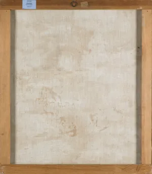 Na odwrocie na górnej listwie krosna nalepka aukcyjna jednego z warszawskich domów aukcyjnych; obok nalepka z numerem (niebieską kredką): 48.