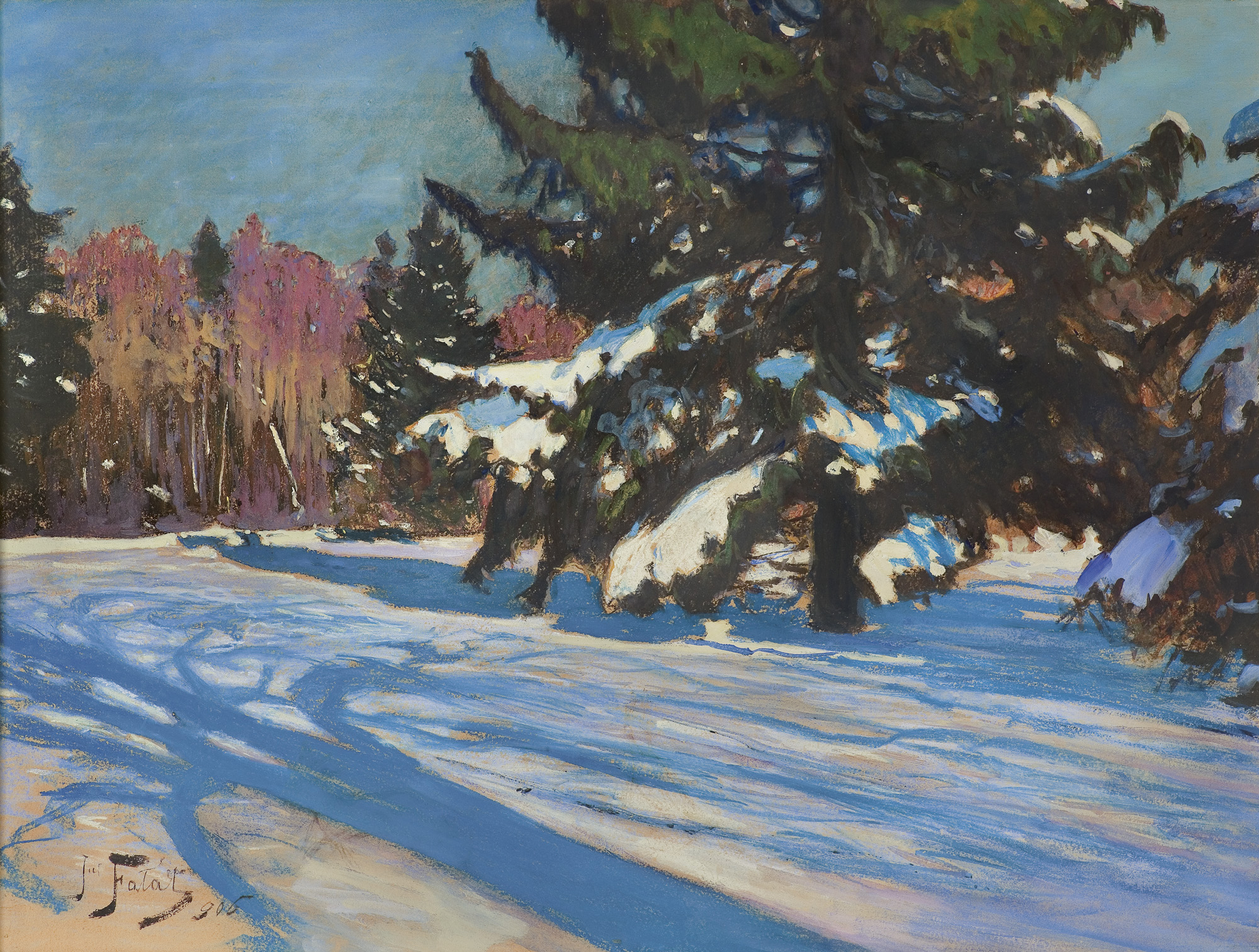 Julian Fałat (Tuligłowy [okręg lwowski] 1853 - Bystra k. Bielska 1929) - malarz i pedagog - jeden z najwybitniejszych artystów polskich okresu przełomu XIX i XX wieku, członek polskich i europejskich stowarzyszeń twórczych oraz Królewskiej Akademii Sztuk Pięknych w Berlinie, wielokrotnie odznaczany medalami na wystawach międzynarodowych. Studiował malarstwo u Władysława Łuszczkiewicza i Leona Dembowskiego w Szkole Sztuk Pięknych w Krakowie (1868-71 i 1881) i w Akademii Sztuk Pięknych w Monachium u Alexandra Strähubera i Johana Leonhardta Raaba (1877-80). Po studiach spędził kilka miesięcy w Rzymie, w 1884 był w Paryżu i w Hiszpanii, a w 1885 odbył podróż morską dookoła świata. W 1886 podczas polowania u ks. Radziwiłłów w Nieświeżu poznał późniejszego cesarza Niemiec Wilhelma II - dla którego następnie w latach 1886-95 pracował w Berlinie jako malarz nadworny. W latach 1894-96 współpracował z Wojciechem Kossakiem przy panoramie Berezyna. W 1895 został powołany na stanowisko dyrektora Szkoły Sztuk Pięknych w Krakowie, w której gruntownie zreformował system nauczania, przekształcając tę uczelnię w nowoczesną Akademię Sztuk Pięknych (r.1900). Do roku 1910 był rektorem Akademii; po przejściu na emeryturę osiadł w miejscowości Bystra k. Bielska. Znakomity akwarelista, malował także olejno. We wcześniejszym okresie tworzył w konwencji realistycznej, z czasem rozjaśnił i wzbogacił paletę, a w akwarelach wprowadzał rozlewną plamę barwną. Zasłynął jako malarz scen myśliwskich rozgrywających się najczęściej w zimowej scenerii; malował też pejzaże, wiejskie sceny rodzajowe, portrety, widoki miejskie.