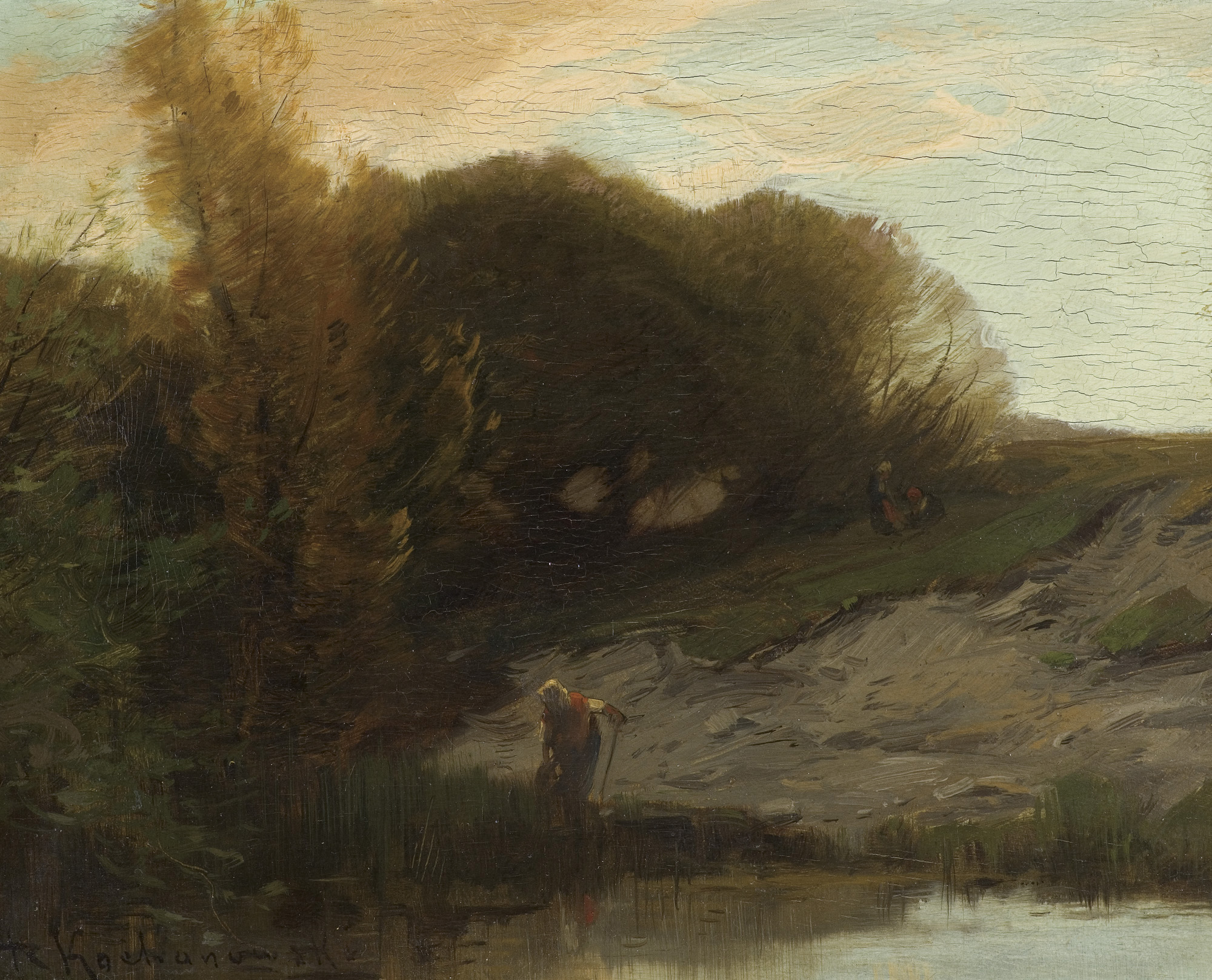 Roman Kochanowski (Kraków 1857 - Freising k. Monachium 1945) - malarz i grafik - był jednym z polskich artystów osiadłych i stałe działających w Monachium. Studia malarskie rozpoczął w Krakowie; początkowo w prywatnej pracowni Maksymiliana Cercha, a w latach 1873- 1875 w Szkole Sztuk Pięknych u Władysława Łuszczkiewicza i pejzażysty Henryka Grabińskiego. Przez następne dwa lata uczył się jeszcze na wydziale pejzażu w Akademii wiedeńskiej. W 1881 przeniósł się do Monachium, gdzie miał własną pracownię, a niebawem założył rodzinę. Często jednak przyjeżdżał do Krakowa, bywał w Poznańskiem, odbył podróż po Galicji i Podolu, rysując krajobrazy i widoki miast, które weszły następnie do albumu wydanego w Wiedniu w roku 1898. Artysta należał do monachijskiego Kunstvereinu, brał udział w wielu wystawach w Niemczech, w Wiedniu, w Londynie; swoje prace przesyłał też na pokazy krajowe. Malował przede wszystkim pejzaże a tylko z rzadka kwiaty i portrety. Stałym i ulubionym motywem jego obrazów był polski, podkrakowski krajobraz z wplecionymi weń postaciami ludzi. Obrazy artysty, malowane często na niewielkich deseczkach, pozbawione warstwy anegdotycznej odznaczają się niecodziennymi walorami malarskimi, harmonią koloru i pełnym liryzmu nastrojem. Zauważane i nagradzane na licznych wystawach były też wysoko cenione na rynku sztuki. W roku 1892, po wystawie w Wiedniu, jeden z obrazów Kochanowskiego zakupił do swoich zbiorów cesarz Franciszek Józef; dwa inne nabyli członkowie cesarskiej rodziny. Wielbicielem jego malarstwa był Karol Józef Luitpold, książę regent Bawarii. Wielka wrażliwość artysty na krajobraz i przyrodę widoczna jest także w jego rysunkach i akwafortach.