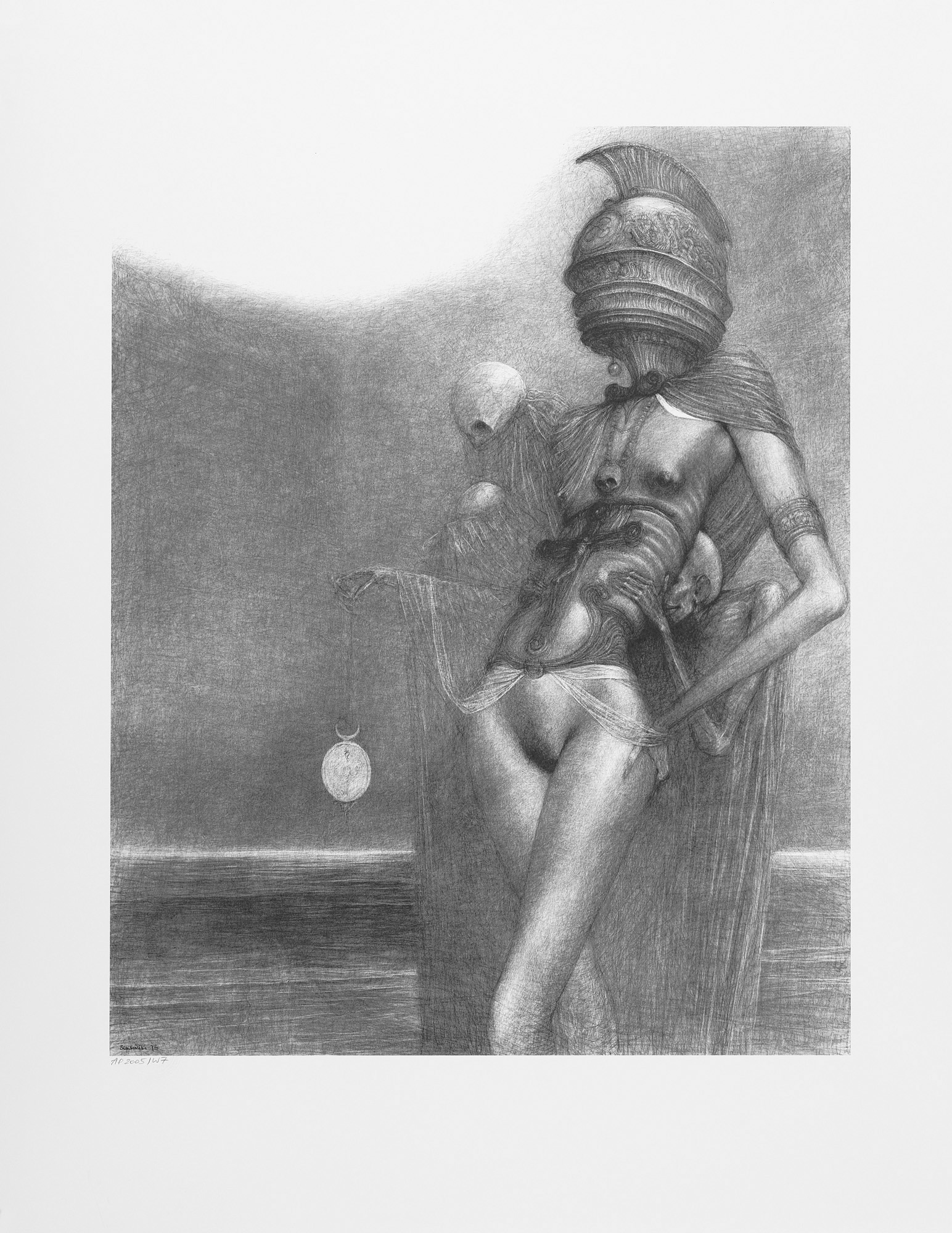 Zdzisław Beksiński (Sanok 24 II 1929 - Warszawa 21 II 2005) studiował w latach 1947-1952 na Wydziale Architektury Politechniki Krakowskiej. Był artystą samoukiem, który osiągnął niekwestionowaną pozycję w polskiej sztuce współczesnej, potwierdzoną obecnością jego prac na prestiżowych wystawach i w kolekcjach muzealnych. Początkowo zajmował się fotografią, którą interesował się od lat studenckich, po 1956 zyskując uznanie jako twórca fotogramów o estetyce opartej o efekty fakturowe. W latach 1958-1962 tworzył abstrakcyjne obrazy-reliefy o bogatej fakturze, głównie metalowe, będące odmianą malarstwa materii. Pod koniec tego okresu powstawały ażurowe formy o kształtach figur i pełnoplastyczne rzeźby w metalu. Kolejnym etapem jego twórczości były lata 1962-1974, kiedy poświęcał się głównie rysunkowi. W latach 60. rysował piórkiem i tuszem figuralne kompozycje odznaczające się karykaturalną deformacją postaci. Od końca lat 60. tworzył rysunki węglem i kredkami, będące monochromatyczną odmianą jego równoległej twórczości malarskiej. Od 1974 zajmował się niemal niepodzielnie malarstwem. Jego charakterystyczny styl bazował na perfekcji technicznej, której towarzyszyła niezwykłość wizji. Malował świat po katastrofie, naznaczony piętnem śmierci i rozpadu. Jego obrazy zaludniają postaci i stwory o ludzkich wprawdzie bądź zwierzęcych kształtach, lecz o cechach fantomów, automatów lub rozpadających się trucheł. Artysta nie nadawał swym obrazom i rysunkom tytułów (poza porządkującymi symbolami), akcentując w ten sposób swój brak zainteresowania dla literackiej strony przedstawień. Sam mówił, że malując całkowicie poddaje się wizji, „fotografuje“ ją. W ostatnich latach włączył do swego warsztatu artystycznego elektroniczne techniki generowania obrazu, które wykorzystywał do tworzenia komputerowych fotomontaży. Sztuka Beksińskiego, wielokrotnie wystawiana i omawiana, budzi skrajne emocje wśród znawców i publiczności.