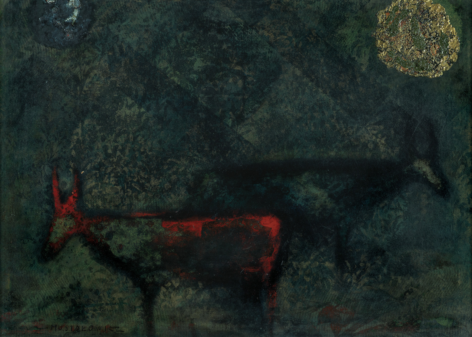 Henryk Musiałowicz (Gniezno 5 I 1914 - Warszawa 24 II 2015) od 1930 uczył się w Państwowej Szkole Sztuk Zdobniczych i Przemysłu Artystycznego w Poznaniu. W 1936 uzyskał absolutorium na Wydziale Malarstwa Dekoracyjnego i Witrażownictwa. W 1937 podjął studia malarskie w warszawskiej ASP pod kierunkiem Felicjana Kowarskiego i Leonarda Pękalskiego (dyplom pod kierunkiem tego pierwszego uzyskał w 1947). Lata okupacji spędził w Warszawie, kontynuując twórczość artystyczną (wykonywał w tym czasie m.in. ekslibrisy). Współpracował z Departamentem Informacji Delegatury Rządu na Kraj. Od 1940 związany był z grupą absolwentów warszawskiej uczelni, działającą w latach okupacji w tzw. Bacciarellówce na terenie Zamku Królewskiego, a po wojnie znaną jako grupa „Warszawa“. W sztuce Musiałowicza, zwłaszcza bezpośrednio po wojnie, silnie zaznaczyły się wątki związane z martyrologią, tragedią Powstania Warszawskiego, zburzeniem Warszawy, której ruiny upamiętnił w cyklu rysunków z 1945-1946. Poszukując formy odpowiedniej dla przeżyć wojennych, znalazł ją w sztuce Holendrów, zwłaszcza Rembrandta, którego twórczość poznał podczas podróży w 1956. Odtąd na stałe zdominował jego malarstwo ciemny koloryt, uspokojona, niekiedy hieratyczna kompozycja form zaledwie sugerujących figury ludzkie, bogata faktura i połyskliwość powierzchni. Z czasem artysta zaczął konstruować formy przestrzenne z drewna, jak zwykle pokrytego bogatą warstwą malarską, w wydłużonych stojących kształtach. Musiałowicz do 1983 aktywnie działał w ZPAP. Był członkiem międzynarodowych organizacji artystycznych, w tym kilku włoskich, jak Accademia Tibertina w Rzymie (od 1965), Accademia Italiana delle Arti e del Lavoro w Parmie (od 1979), Accademia Europea, Calvatone (od 1985). W 2002 wielką retrospektywę jego twórczości zorganizowało Muzeum Narodowe w Poznaniu.