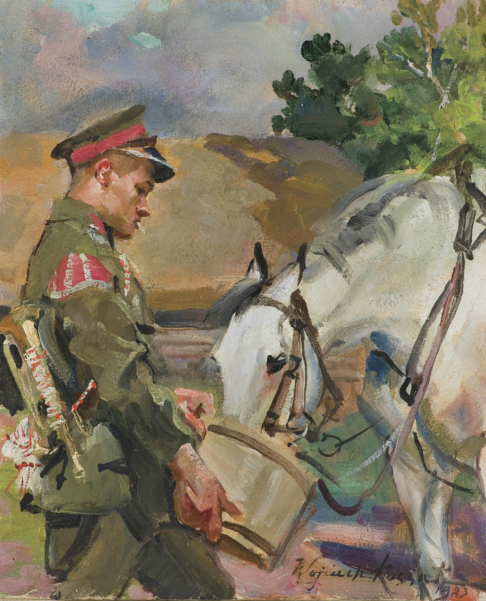 Wojciech Kossak (Paryż 1856 - Kraków 1942 ) – powszechnie znany malarz, postrzegany przede wszystkim jako świetny batalista. Syn i uczeń Juliusza Kossaka kształcił się w krakowskiej Szkole Sztuk Pięknych, w Akademii monachijskiej oraz w Paryżu. W latach 1895-1902 przebywał głównie w Berlinie, pracując dla cesarza Wilhelma II. Wiele podróżował, m.in. do Hiszpanii i Egiptu, gdzie wykonywał szkice do zamierzonych panoram. W późniejszych latach kilkakrotnie wyjeżdżał do Stanów Zjednoczonych wykonując zamówienia portretowe. W 1913 był mianowany profesorem warszawskiej Szkoły Sztuk Pięknych. W latach I wojny światowej pełnił służbę wojskową. Był współautorem panoram: „Racławice” (1893-1894), „Berezyna” (1895-1896), „Bitwa pod piramidami” (1901) oraz szkiców do niezrealizowanej „Somosierry” (1900). Z temperamentem i swobodą tworzył szeroko malowane, dynamiczne sceny batalistyczne, historyczne, rodzajowe oraz liczne portrety. Z upodobaniem malował konie. Jego obrazy, gloryfikujące dawne i współczesne artyście polskie wojsko i bohaterstwo żołnierzy, trafiały do patriotycznych uczuć odbiorców i cieszyły się ogromna popularnością.