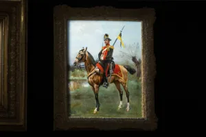 Wojciech Kossak (Paryż 1856 - Kraków 1942 ) – powszechnie znany malarz, postrzegany przede wszystkim jako świetny batalista. Syn i uczeń Juliusza Kossaka kształcił się w krakowskiej Szkole Sztuk Pięknych, w Akademii monachijskiej oraz w Paryżu. W latach 1895-1902 przebywał głównie w Berlinie, pracując dla cesarza Wilhelma II. Wiele podróżował, m.in. do Hiszpanii i Egiptu, gdzie wykonywał szkice do zamierzonych panoram. W późniejszych latach kilkakrotnie wyjeżdżał do Stanów Zjednoczonych wykonując zamówienia portretowe. W 1913 był mianowany profesorem warszawskiej Szkoły Sztuk Pięknych. W latach I wojny światowej pełnił służbę wojskową. Był współautorem panoram: „Racławice” (1893-1894), „Berezyna” (1895-1896), „Bitwa pod piramidami” (1901) oraz szkiców do niezrealizowanej „Somosierry” (1900). Z temperamentem i swobodą tworzył szeroko malowane, dynamiczne sceny batalistyczne, historyczne, rodzajowe oraz liczne portrety. Z upodobaniem malował konie. Jego obrazy, gloryfikujące dawne i współczesne artyście polskie wojsko i bohaterstwo żołnierzy, trafiały do patriotycznych uczuć odbiorców i cieszyły się ogromna popularnością.
