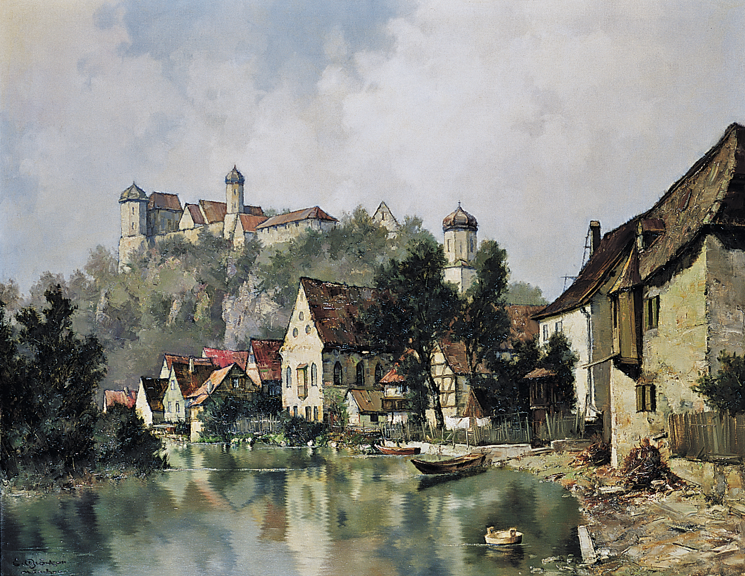 Ernst Bröcker - niemiecki pejzażysta; malował nastrojowe wysokogórskie widoki z Bawarii, krajobrazy z torfowisk i bagien w okolicach Dachau oraz weduty miejskie.