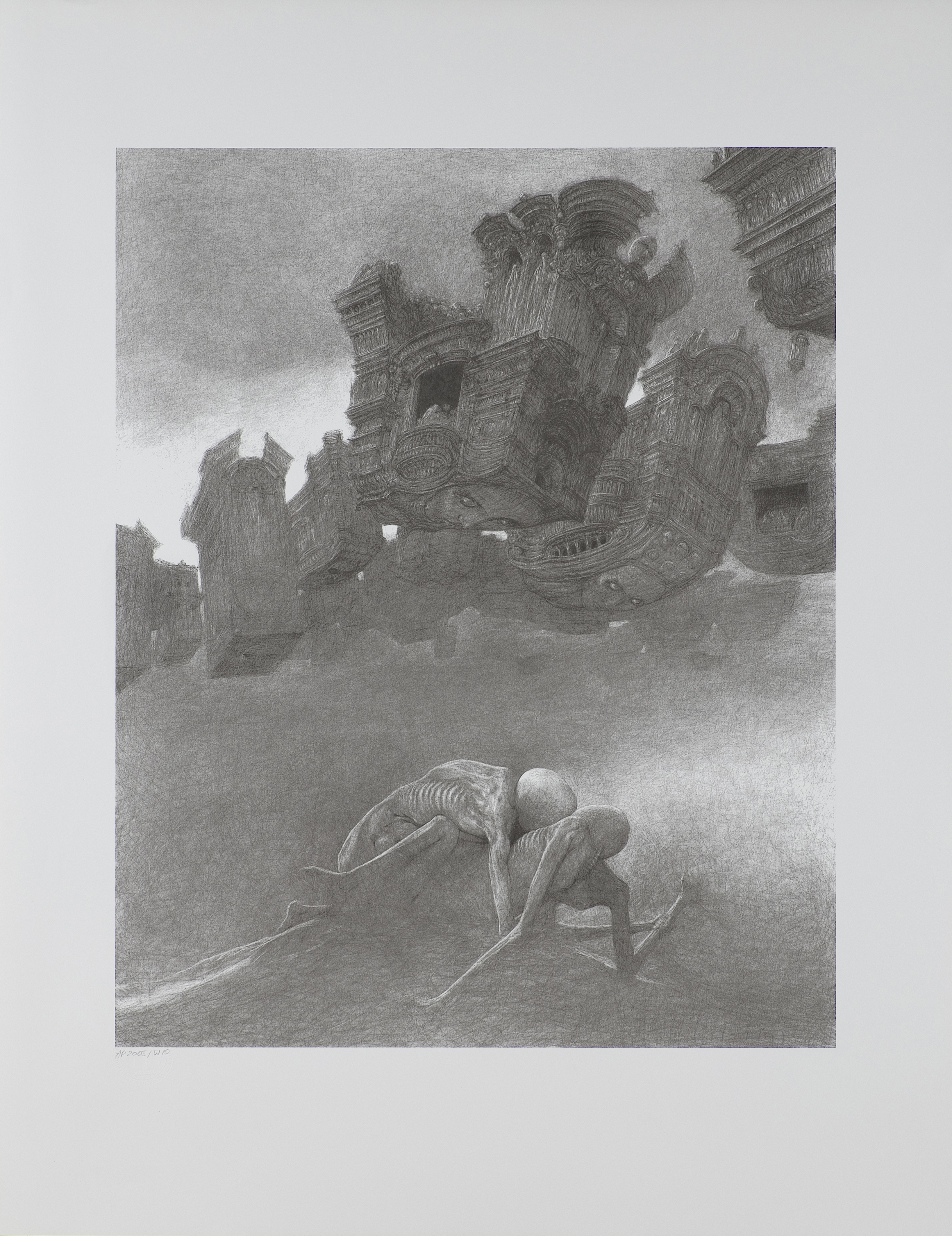 Zdzisław Beksiński (Sanok 24 II 1929 - Warszawa 21 II 2005) studiował w latach 1947-1952 na Wydziale Architektury Politechniki Krakowskiej. Był artystą samoukiem, który osiągnął niekwestionowaną pozycję w polskiej sztuce współczesnej, potwierdzoną obecnością jego prac na prestiżowych wystawach i w kolekcjach muzealnych. Początkowo zajmował się fotografią, którą interesował się od lat studenckich, po 1956 zyskując uznanie jako twórca fotogramów o estetyce opartej o efekty fakturowe. W latach 1958-1962 tworzył abstrakcyjne obrazy-reliefy o bogatej fakturze, głównie metalowe, będące odmianą malarstwa materii. Pod koniec tego okresu powstawały ażurowe formy o kształtach figur i pełnoplastyczne rzeźby w metalu. Kolejnym etapem jego twórczości były lata 1962-1974, kiedy poświęcał się głównie rysunkowi. W latach 60. rysował piórkiem i tuszem figuralne kompozycje odznaczające się karykaturalną deformacją postaci. Od końca lat 60. tworzył rysunki węglem i kredkami, będące monochromatyczną odmianą jego równoległej twórczości malarskiej. Od 1974 zajmował się niemal niepodzielnie malarstwem. Jego charakterystyczny styl bazował na perfekcji technicznej, której towarzyszyła niezwykłość wizji. Malował świat po katastrofie, naznaczony piętnem śmierci i rozpadu. Jego obrazy zaludniają postaci i stwory o ludzkich wprawdzie bądź zwierzęcych kształtach, lecz o cechach fantomów, automatów lub rozpadających się trucheł. Artysta nie nadawał swym obrazom i rysunkom tytułów (poza porządkującymi symbolami), akcentując w ten sposób swój brak zainteresowania dla literackiej strony przedstawień. Sam mówił, że malując całkowicie poddaje się wizji, „fotografuje“ ją. W ostatnich latach włączył do swego warsztatu artystycznego elektroniczne techniki generowania obrazu, które wykorzystywał do tworzenia komputerowych fotomontaży. Sztuka Beksińskiego, wielokrotnie wystawiana i omawiana, budzi skrajne emocje wśród znawców i publiczności.