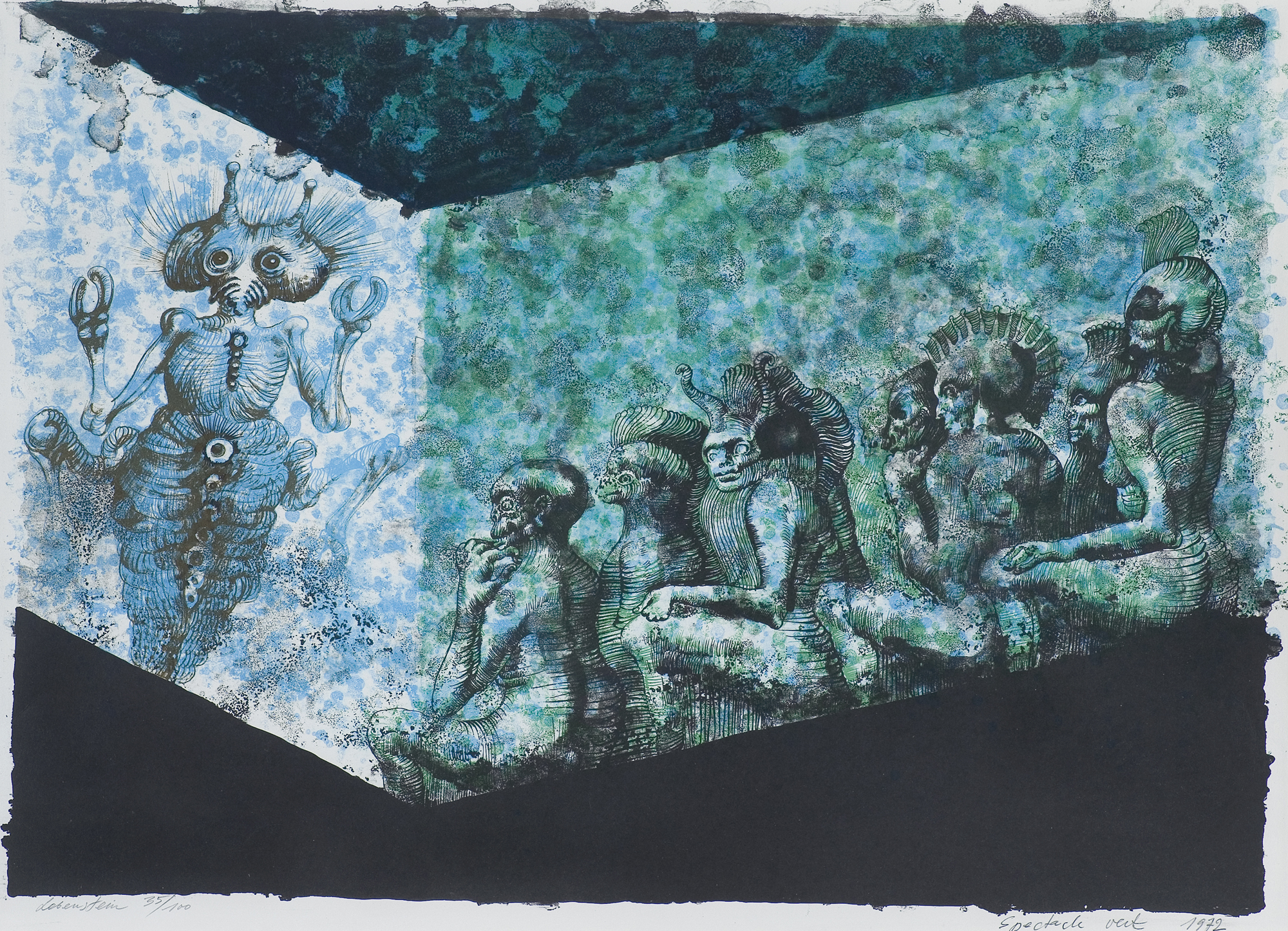 Jan Lebenstein (Brześć Litewski 1930 - Kraków 1999) w latach 1948-1954 studiował malarstwo w ASP w Warszawie pod kierunkiem prof. Eugeniusza Eibischa i Artura Nachta-Samborskiego. W 1955 wziął udział w wystawie w warszawskim Arsenale. Zaprzyjaźniony w czasie studiów z Mironem Białoszewskim, swą pierwszą wystawę indywidualną pokazał w 1956 w Teatrze na Tarczyńskiej. W 1959 zdobył Grand Prix de la Ville de Paris na I Biennale Młodych w Paryżu i w tym roku przeniósł się na stałe do Paryża. Po seriach "figur kreślonych" (na papierze milimetrowym) i "figur hieratycznych" z lat 1955-1958 maluje cykl "figur osiowych" (1958-1962), które wystawia w Paryżu i USA. Równolegle w 1960 zaczyna rysowane "karnety", rodzaj dziennika, który w przyszłości dostarczy motywów wykorzystanych w obrazach. W latach 1964-1965 maluje "Bestiarium", cykl fakturowych, archaizowanych stworów przypominających prehistoryczne wykopaliska. Bezpośrednio po nich wprowadza do swych obrazów postaci ludzkie i fantastyczne, odgrywające sceny ni to mitologiczne, ni to ze snu, często przesycone erotyką. W 1970 projektuje witraże dla Centre du Dialogue w Paryżu. W W 1971 otrzymuje obywatelstwo francuskie 1974 powstają gwasze inspirowane Folwarkiem zwierzęcym George'a Orwella. W latach 1976-1989 tworzy wyłącznie w technice gwaszu i pastelu, podejmując tematykę mitologiczną i zaczerpniętą z Biblii: cykle ilustracji do Księgi Hioba (wyd. 1979) i do Apokalipsy (wyd. 1986) w nowych przekładach Czesława Miłosza. W 1989 powraca do malarstwa olejnego (cykl "Pergamon"). Artysta otrzymał m. in. nagrodę Fundacji im. Alfreda Jurzykowskiego w 1976, Nagrodę Muzeum Archidiecezji Warszawskiej w 1985, Nagrodę im. Jana Cybisa w 1987.