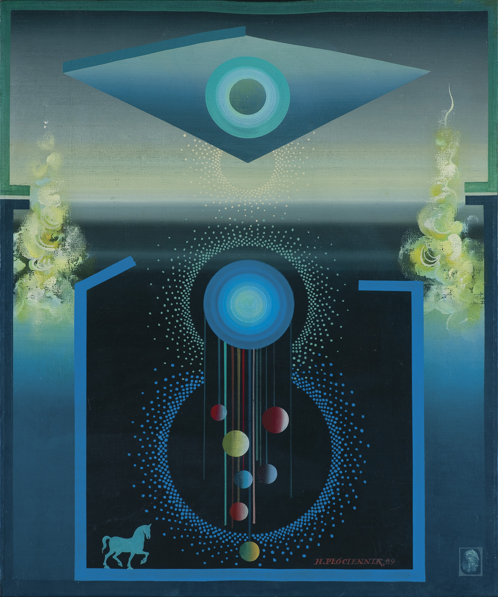 Henryk Płóciennik (Łódź 1933, Łódź 2020) malarz i grafik samouk. Zdobył wysoką pozycję jako grafik, pracujący głównie w technikach linorytu i autocynkografii. Jest autorem fantastycznych kompozycji o bogatym, ornamentalnym opracowaniu, obrazujących w zamyśle autora kosmiczne piękno i ład świata. Wielokrotnie wystawiał w kraju i za granicą, zdobywając liczne nagrody. Jego twórczość jest reprezentowana w czołowych zbiorach muzealnych, jak Muzeum Sztuki w Łodzi, liczne muzea narodowe i okręgowe, Biblioteka Jagiellońska i in. W 2004 w Łodzi powstała Fundacja „Arkadia” jego imienia, której celem jest zebranie, opracowanie i popularyzacja twórczości artysty. Artysta był również miłośnikiem i kolekcjonerem nagrań muzyki jazzowej.