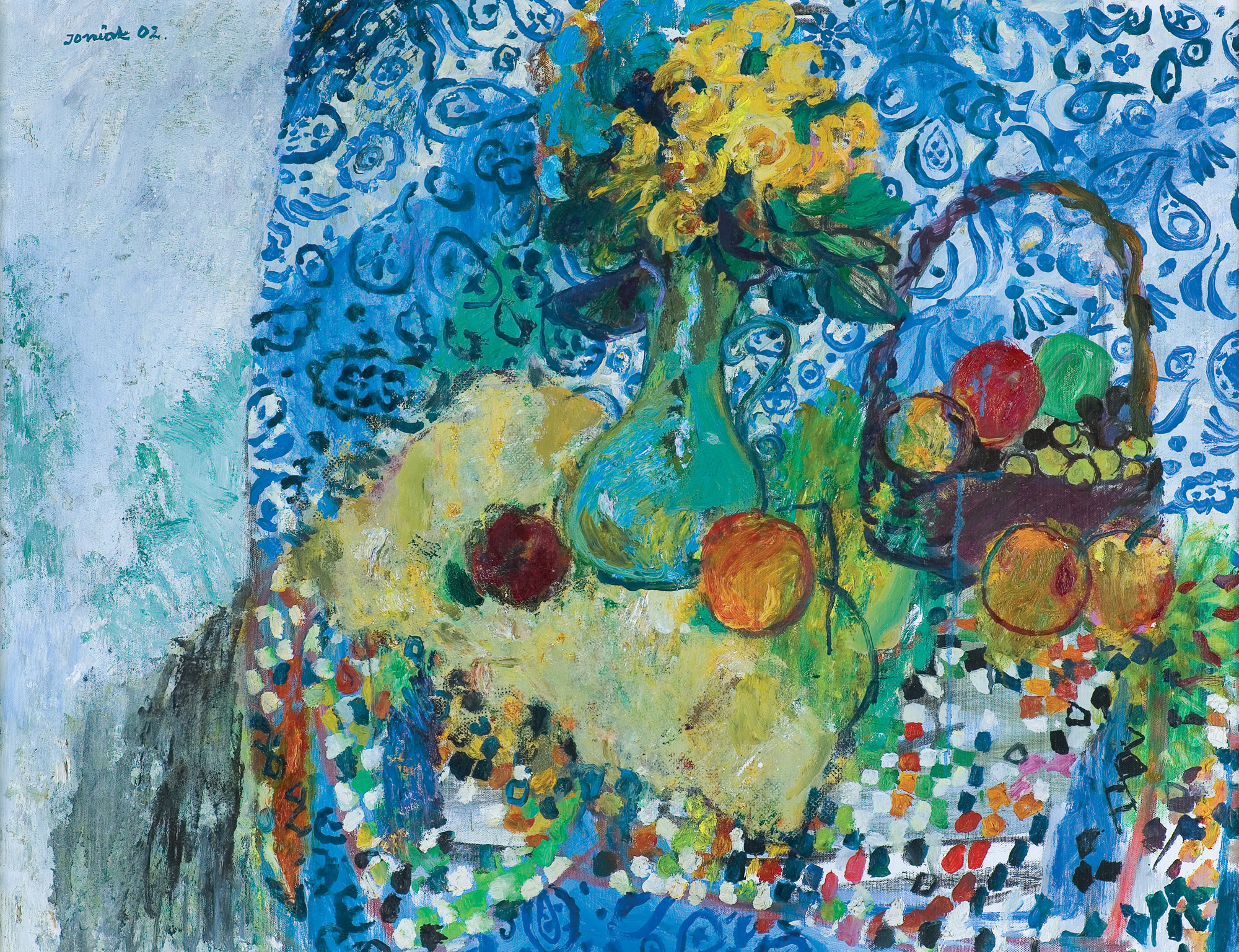 Juliusz Joniak (Lwów 19 XI 1925 - Kraków 2021) studiował w latach 1945-1949 na Wydziale Malarstwa i Grafiki Akademii Sztuk Pięknych w Krakowie pod kierunkiem Czesława Rzepińskiego i Konrada Srzednickiego. Dyplom uzyskał w 1955. Od 1950 pracuje jako pedagog w macierzystej uczelni, od 1980 był jej profesorem. W latach 1978-1981 był dziekanem Wydziału Malarstwa, a w 1981-1987 prorektorem ASP. We wczesnych latach uczestniczył w II, III i IV Ogólnopolskiej Wystawie Plastyki (1951-1954), a także w słynnej wystawie w warszawskim Arsenale (1955) i jej niemieckich edycjach pn. „Junge Generation“ w Berlinie i Lipsku (1956). W tym okresie reprezentował nurt malarstwa figuratywnego o wyraźnym rysunku i lekkich, płasko kładzionych polach koloru. W latach 60. malował tajemnicze, pełne metaforycznych odniesień Wnętrza i Martwe natury, w których chętnie eksperymentował z fakturą w duchu malarstwa materii. W kolejnej dekadzie zainteresował się kompozycjami figuralnymi (cykl „Kalejdoskop“ z przełomu lat 60. i 70.), tworząc pastisze klasycznego malarstwa z wielkich epok sztuki ("Akt z futrem wg Rubensa", 1973). Ten wątek z czasem przybrał formę monumentalnych poliptyków (seria "Karol IV z rodziną wg Goyi", 1979-1981; "Kobiety algierskie wg Delacroix", 1987). Równolegle od wczesnych lat 80. w malarstwie Joniaka dominuje pejzaż, głównie krajów południowych (Francja, Hiszpania, Włochy). Artysta czerpie swobodnie ze środków wypracowanych przez postimpresjonistów i ekspresjonistów przedwojennej Ecole de Paris, nade wszystko zaś obserwuje i zamyka w skończoną, piękną formę grę czystych kolorów w ostrym porannym świetle. Świeżość i czystość kolorów jest cechą wyróżniającą jego sztukę na tle rzeszy malarzy zafascynowanych urodą południowych plenerów. W 1995 artysta wygrał VII Festiwal Sztuki w Magné (Francja), co otworzyło mu drogę do honorowego członkostwa Académie Européenne des Arts w Paryżu.