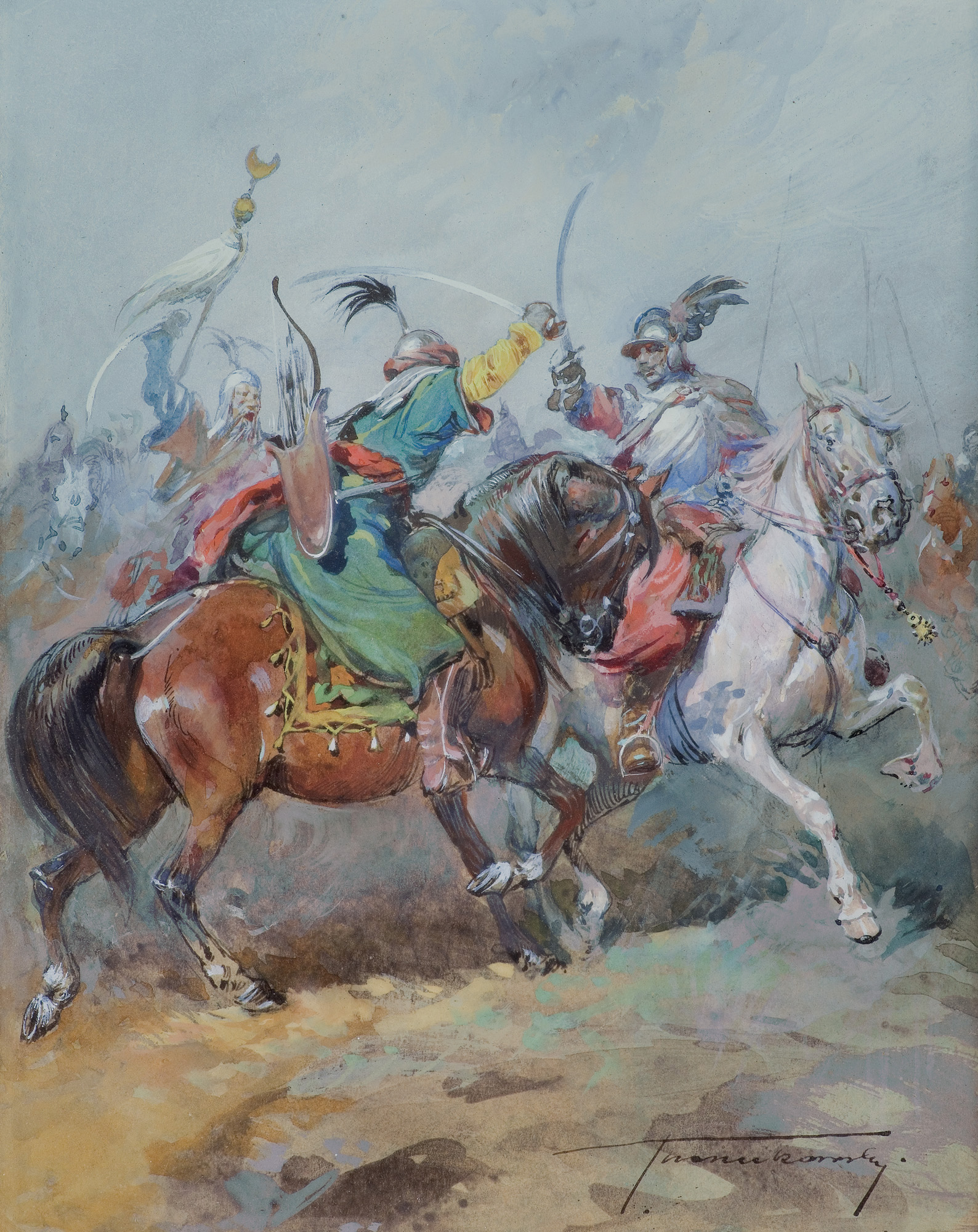 Antoni Trzeszczkowski – (1902–1977) to artysta, który niesłusznie pozostaje w cieniu bardziej znanych batalistów, mimo że jego twórczość dorównuje najlepszym przedstawicielom tego gatunku. Jego malarstwo cechuje niezwykła dynamika, precyzja rysunku oraz wyjątkowe wyczucie ruchu, zwłaszcza w przedstawieniach koni i bitewnych scen. W jego obrazach można dostrzec pasję i głęboką znajomość wojskowości, co sprawia, że są one nie tylko dziełami sztuki, ale także wartościowymi rekonstrukcjami historycznymi.