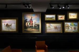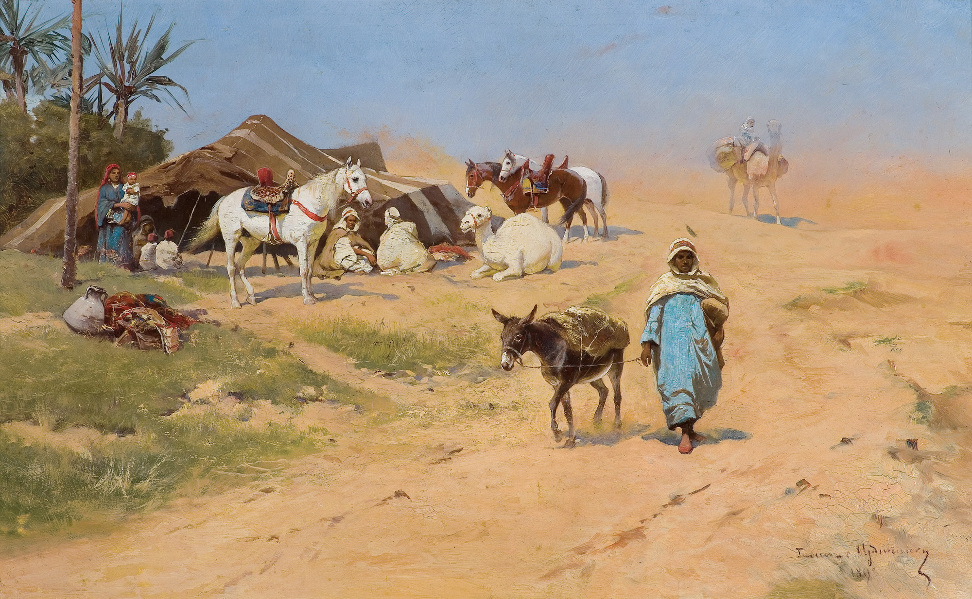 Tadeusz Ajdukiewicz (Bochnia 1851 - Kraków 1916) był artystą związanym z mecenatem arystokracji i dworów panujących; w tych kręgach zrobił prawdziwą karierę, a jego obrazy podobały się powszechnie. Studia malarskie rozpoczął w krakowskiej Szkole Sztuk Pięknych. Później kształcił się jeszcze w Wiedniu oraz w Monachium - w Akademii i w pracowni Józefa Brandta. Po studiach przez kilka lat jeździł po polskich dworach kresowych i malował portrety. Około 1877 wyjechał do Paryża, skąd, wraz z Władysławem Branickim wyjechał w – ważną dla jego przyszłej twórczości – podróż na Bliski Wschód. Około roku 1882 zamieszkał w Wiedniu, zajął pracownię po Hansie Makarcie (zm. 1884), malując dla dworu cesarskiego i arystokracji. W 1893 bawił w Londynie, gdzie, m.in. portretował księcia Walii, w 1894 pracował na dworze sułtańskim w Konstantynopolu, następnie także w Sofii, Petersburgu i Bukareszcie. W Rumunii osiadł na dłużej jako malarz nadworny Karola I. Po wybuchu I wojny światowej powrócił do kraju i, mimo starszego wieku, zaciągnął się do Legionów. Zmarł, nie wytrzymawszy trudów wojennych. Malował przede wszystkim portrety - zarówno reprezentacyjne, efektowne i eleganckie (Portret Heleny Modrzejewskiej, MNK), jak również skromne i kameralne. Tworzył też sceny myśliwskie, obrazy o tematyce wschodniej, bohaterskie sceny bitewne, rewie i przeglądy wojsk (Przegląd armii rumuńskiej, 1896).