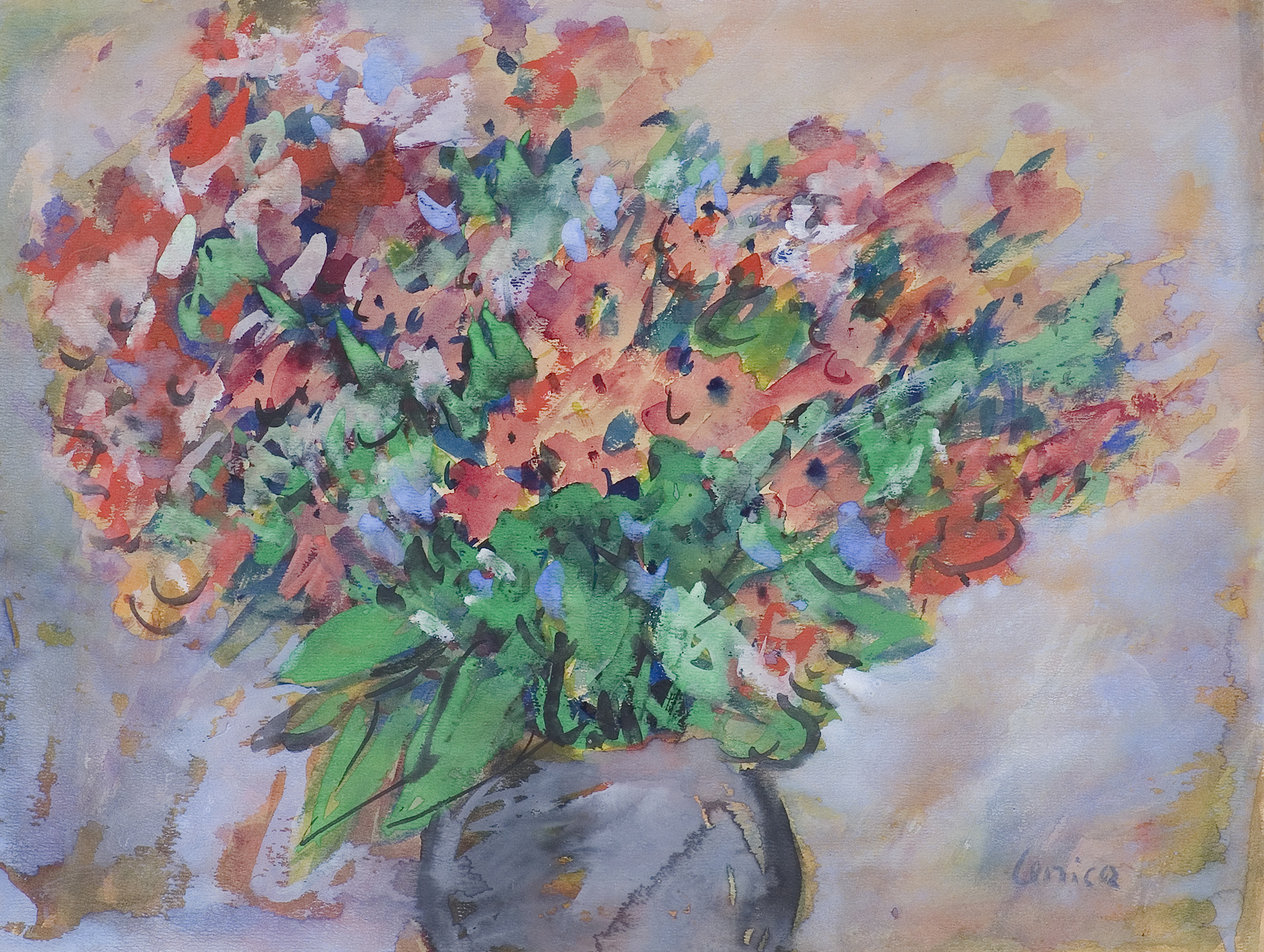 Alfred Lenica (Pabianice 1899 - Warszawa 1977) uczył się prywatnie rysunku i malarstwa w pracowniach Artura Hannytkiewicza i Piotra Kubowicza w Poznaniu (1925-1928). W latach 30. malował obrazy figuratywne, nawiązujące w stylistyce do kubizmu. Nieco później uległ wpływom surrealizmu, który, pomijając lata socrealizmu, stanie się dlań najpoważniejszym obszarem poszukiwań malarskich. Od połowy lat 40. utrzymywał stałe kontakty z kręgiem „Grupy Krakowskiej“, przyjaźnił się z Jerzym Kujawskim. Po przeniesieniu się do Poznania, w 1947 został współzałożycielem awangardowej grupy „4F+R“ (farba, forma, fantastyka, faktura + realizm). Jest autorem pierwszego polskiego obrazu taszystowskiego (Farby w ruchu, 1949, tempera). W okresie socrealizmu włączył się w nurt oficjalnej sztuki, pracując jednocześnie jako organizator życia artystycznego, prezes Okręgu Poznańskiego ZPAP (1948-1950) i jednocześnie kierownik Pracowni Sztuk Plastycznych tamże. W końcu lat 50. przeniósł się do Warszawy i również tu do 1969 pełnił kierownicze funkcje w ZPAP. W drugiej poł. lat 50. ponownie - po eksperymentach z lat 40. - uprawiał informel, malując chętnie techniką drippingu. Około 1958 wypracował indywidualny, charakterystyczny dlań styl wirujących, kolorowych, niekiedy kaligraficznie opracowanych form, które dynamicznie wypełniały pola obrazów. Tworzył je techniką zbliżoną do surrealistycznej dekalkomanii. Styl ten stał się znakiem rozpoznawczym artysty do końca życia. W swych obrazach nie unikał kształtów nawiązujących do form naturalnych (jego malarstwo nazywano „biologicznym“), a w latach 70. niekiedy włączał do kompozycji motywy figuralne. Wystawa retrospektywna artysty odbyła się w Galerii Zachęta w Warszawie w 1974.