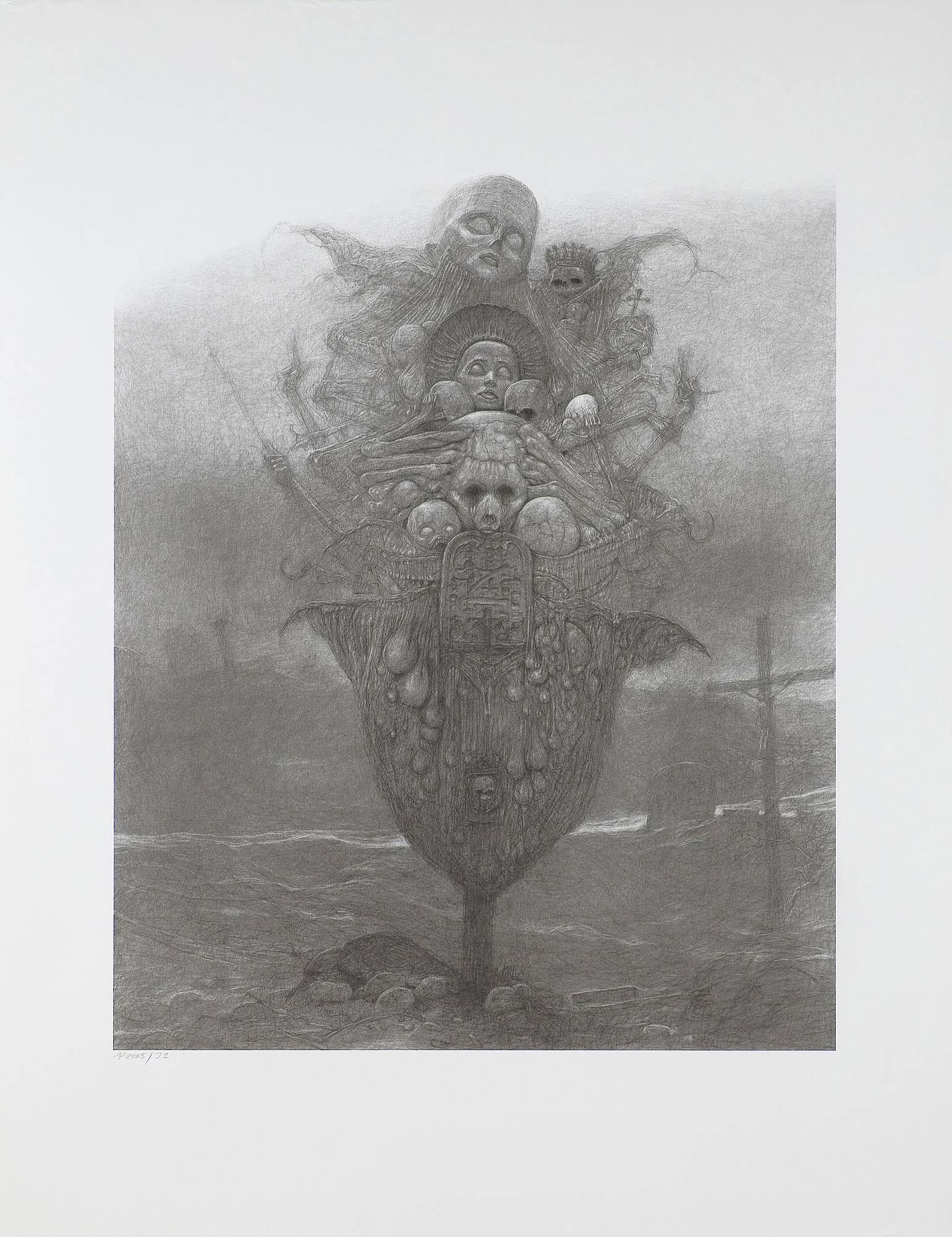 Zdzisław Beksiński (Sanok 24 II 1929 - Warszawa 21 II 2005) studiował w latach 1947-1952 na Wydziale Architektury Politechniki Krakowskiej. Był artystą samoukiem, który osiągnął niekwestionowaną pozycję w polskiej sztuce współczesnej, potwierdzoną obecnością jego prac na prestiżowych wystawach i w kolekcjach muzealnych. Początkowo zajmował się fotografią, którą interesował się od lat studenckich, po 1956 zyskując uznanie jako twórca fotogramów o estetyce opartej o efekty fakturowe. W latach 1958-1962 tworzył abstrakcyjne obrazy-reliefy o bogatej fakturze, głównie metalowe, będące odmianą malarstwa materii. Pod koniec tego okresu powstawały ażurowe formy o kształtach figur i pełnoplastyczne rzeźby w metalu. Kolejnym etapem jego twórczości były lata 1962-1974, kiedy poświęcał się głównie rysunkowi. W latach 60. rysował piórkiem i tuszem figuralne kompozycje odznaczające się karykaturalną deformacją postaci. Od końca lat 60. tworzył rysunki węglem i kredkami, będące monochromatyczną odmianą jego równoległej twórczości malarskiej. Od 1974 zajmował się niemal niepodzielnie malarstwem. Jego charakterystyczny styl bazował na perfekcji technicznej, której towarzyszyła niezwykłość wizji. Malował świat po katastrofie, naznaczony piętnem śmierci i rozpadu. Jego obrazy zaludniają postaci i stwory o ludzkich wprawdzie bądź zwierzęcych kształtach, lecz o cechach fantomów, automatów lub rozpadających się trucheł. Artysta nie nadawał swym obrazom i rysunkom tytułów (poza porządkującymi symbolami), akcentując w ten sposób swój brak zainteresowania dla literackiej strony przedstawień. Sam mówił, że malując całkowicie poddaje się wizji, „fotografuje“ ją. W ostatnich latach włączył do swego warsztatu artystycznego elektroniczne techniki generowania obrazu, które wykorzystywał do tworzenia komputerowych fotomontaży. Sztuka Beksińskiego, wielokrotnie wystawiana i omawiana, budzi skrajne emocje wśród znawców i publiczności.