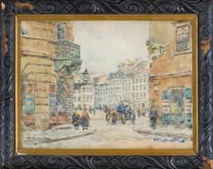 Tadeusz Cieślewski (Warszawa 1870 – Warszawa 1956) - ojciec grafika Tadeusza Cieślewskiego - studia artystyczne rozpoczął w warszawskiej Szkole Rysunkowej pod kierunkiem W. Gersona i J. Kauzika. W latach 1895-1896 kształcił się w Paryżu w Académie Vitti oraz u E. Aman-Jeana i R. Collina. W 1900 podróżował do Włoch i krótko studiował w Akademii rzymskiej. Stale mieszkał w Warszawie, aktywnie uczestnicząc w życiu artystycznym miasta. Debiutował na wystawie w warszawskiej Zachęcie w roku 1897; w 1898 otrzymał srebrny medal w konkursie na serię pocztówek warszawskich. Od 1906 był członkiem TZSP kilkakrotnie pełniąc funkcję wiceprezesa tego Towarzystwa. W 1929 otrzymał srebrny medal TZSP, w roku 1935 wyróżniono go dyplomem honorowym. Był współzałożycielem stowarzyszenia Sztuka i Rzemiosło (1904), należał do ugrupowania Pro Arte. Dużo wystawiał; przede wszystkim w Warszawie – w Zachęcie oraz, m.in. w Salonach Richlinga, Garlińskiego, Salonie Sztuki. Brał udział w wystawach sztuki polskiej za granicę – w 1924 w Moskwie, w 1936 na XX Biennale w Wenecji, w 1939 w Nowym Jorku. W czasie powstania warszawskiego utracił większość swego dorobku artystycznego. Kilka lat powojennych spędził w Piotrkowie, ale w 1948 wrócił do Warszawy. Był przede wszystkim malarzem architektury, szczególnie chętnie malował widoki ulic i placów Warszawy. Rzadziej tworzył pejzaże, martwe natury, portrety i kompozycje figuralne. Jego ulubioną techniką była akwarela, ale malował także olejno i pastelami. Dwukrotnie – w 1928 i 1951 – otrzymał nagrodę miasta Warszawy; odznaczony był także Złotym Krzyżem Zasługi oraz Krzyżem Oficerskim i Komandorskim orderu Odrodzenia Polski.