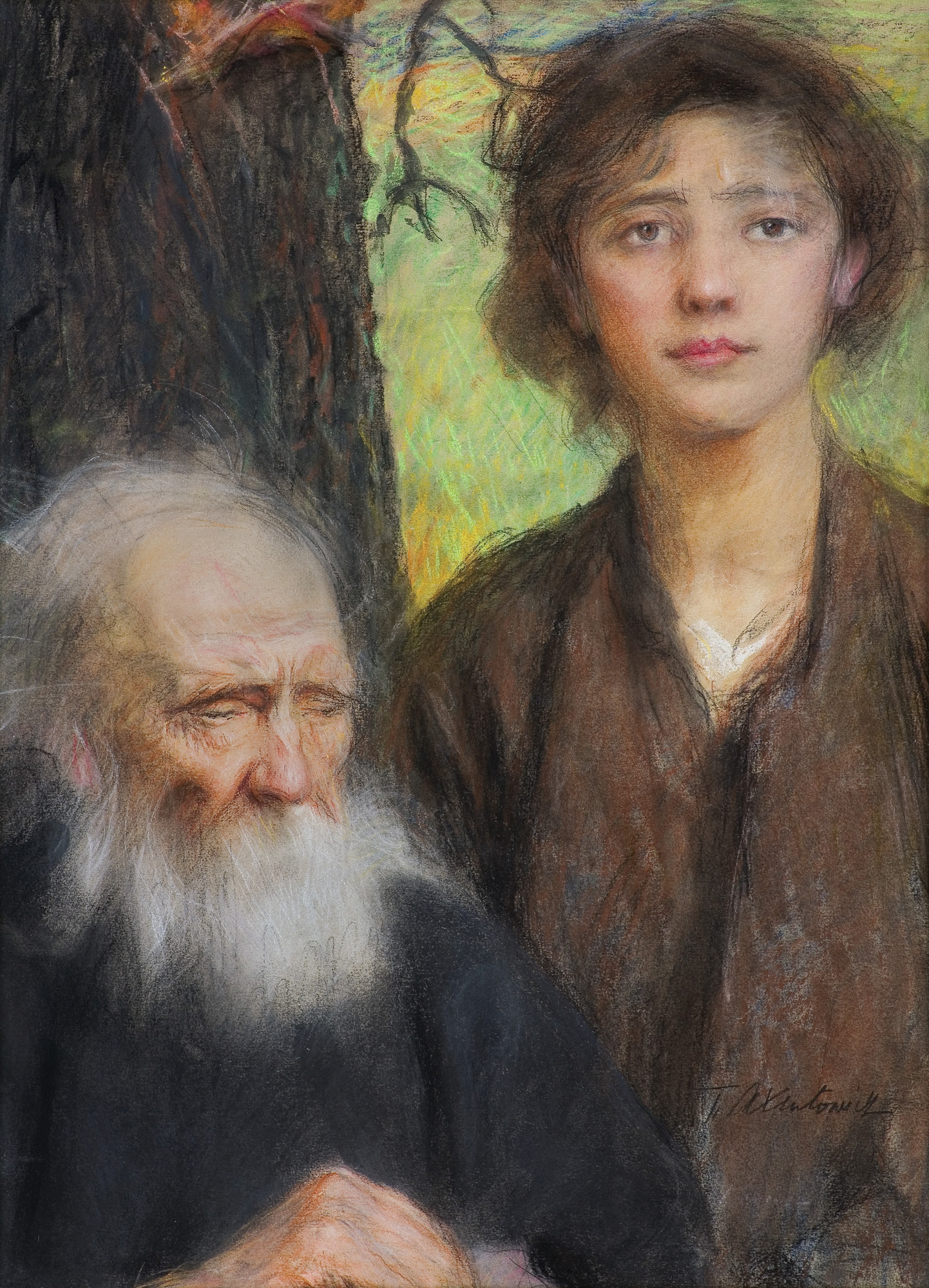Teodor Axentowicz (Braszów w Siedmiogrodzie 1859 - Kraków 1938) – malarz, pastelista, litograf – był jednym z najbardziej znanych i cenionych malarzy polskich. Kształcił się w Akademii Sztuk Pięknych w Monachium pod kierunkiem Gabriela Hackla, Aleksandra Wagnera, Gyuli Benczúra. Studia uzupełniał w Paryżu, gdzie następnie przebywał przez lat kilkanaście. Brał udział w paryskich Salonach; w 1890 otrzymał członkostwo Société Nationale des Beaux-Arts. W tym czasie wielokrotnie wyjeżdżał również do Londynu. W 1895 powrócił do kraju i zamieszkał na stałe w Krakowie, powołany na profesora tamtejszej Szkoły Sztuk Pięknych (od 1900 Akademii). W uczelni tej nauczał nieprzerwanie do 1934, dwukrotnie pełniąc funkcję rektora (lata 1910-11 oraz 1927-28). Był jednym z członków-założycieli Towarzystwa Artystów Polskich „Sztuka”, członkiem wiedeńskiej „Secesji” i współpracownikiem jej pisma „Ver Sacrum”. Powodzenie przyniosły mu zwłaszcza idealizowane wizerunki wytwornych dam oraz wdzięczne portrety dziecięce. Malował też obrazy o tematyce rodzajowej; był jednym z pierwszych malarzy Huculszczyzny i Hucułów. Tworzył obrazy historyczne i kompozycje symboliczne związane z upływem czasu, przemijaniem, starością. We wczesnym, monachijskim okresie były to obrazy utrzymane w duchu akademickiego realizmu; na późniejszą twórczość artysty wywarło wpływ angielskie malarstwo XVIII w. oraz dzieła malarzy współczesnych - Boldoniego, Whistlera, Sargenta. Jego obrazy cechuje dekoracyjność, elegancja, świeżość subtelnej gamy kolorów i delikatna secesyjna stylizacja. Początkowo malował olejno i akwarelą, a po 1890 przede wszystkim mistrzowsko opanowaną techniką pastelu. Zajmował się ilustratorstwem i litografią, projektował plakaty wystaw „Sztuki”.