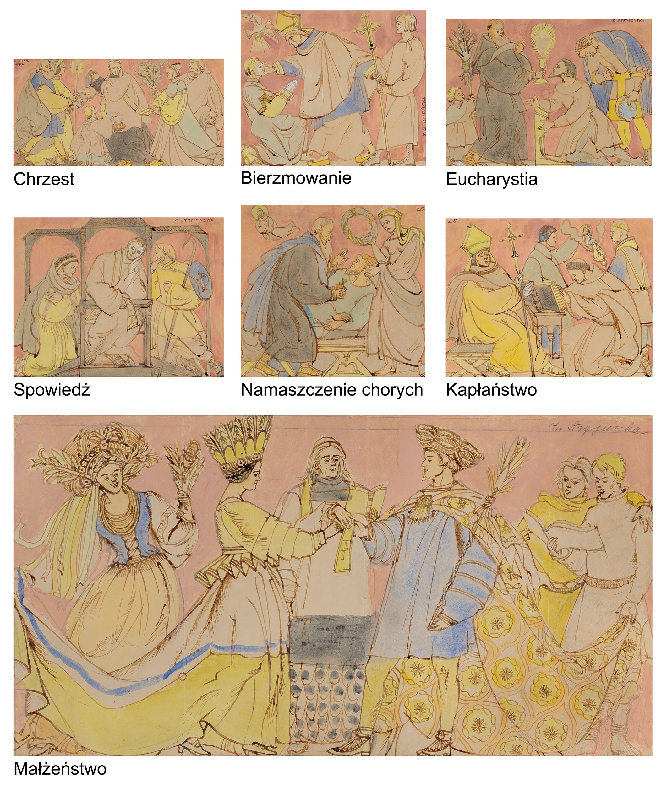 Zofia Stryjeńska, z domu Lubańska (Kraków 1891 - Genewa 1976) - malarka, ilustratorka, scenograf - była jedną z barwniejszych postaci polskiego środowiska artystycznego w dwudziestoleciu międzywojennym. Po krótkim okresie nauki u Leonarda Stroynowskiego i w krakowskiej szkole Marii Niedzielskiej wyjechała do Monachium, gdzie w latach 1911-1912 w męskim przebraniu studiowała w Akademii Sztuk Pięknych (kobiet wówczas na studia nie przyjmowano). Debiutowała w krakowskim TPSP w roku 1912 cyklem kartonów Polskich bajd inspirowanych opowieściami ludowymi. W 1916 wyszła za mąż za Karola Stryjeńskiego. Do 1919 mieszkała w Krakowie, później w Paryżu, Krakowie, Zakopanem i Warszawie. W roku 1925 odniosła międzynarodowy sukces na Wystawie Sztuki Dekoracyjnej w Paryżu, otrzymując Gran Prix w czterech działach (malarstwo, plakat, tkanina, ilustracja) oraz Diplom d’Honneur za projekty zabawek. Zajmowała się dekoracyjnym malarstwem architektonicznym, polichromią, ilustratorstwem, scenografią (m.in. Harnasie Karola Szymanowskiego; 1938), wzornictwem przemysłowym (projekty kilimów, zabawek). Stworzyła własny specyficzny styl w dekoracyjnie stylizowanych, barwnych, pełnych dynamiki i temperamentu obrazach; temperach, akwarelach i gwaszach. W ich tematyce odwoływała się do legend, wierzeń, historii i obyczajowości ludowej. Wydała kilka tek graficznych (Bożki słowiańskie, 1917 i 1922) i albumów reprodukcji (Tańce polskie, 1927; Pascha, 1929; Piastowie, 1929; Gusła Słowian / Magie Slave, 1934). Jej prace popularyzowane były także przez liczne barwne pocztówki.
