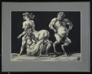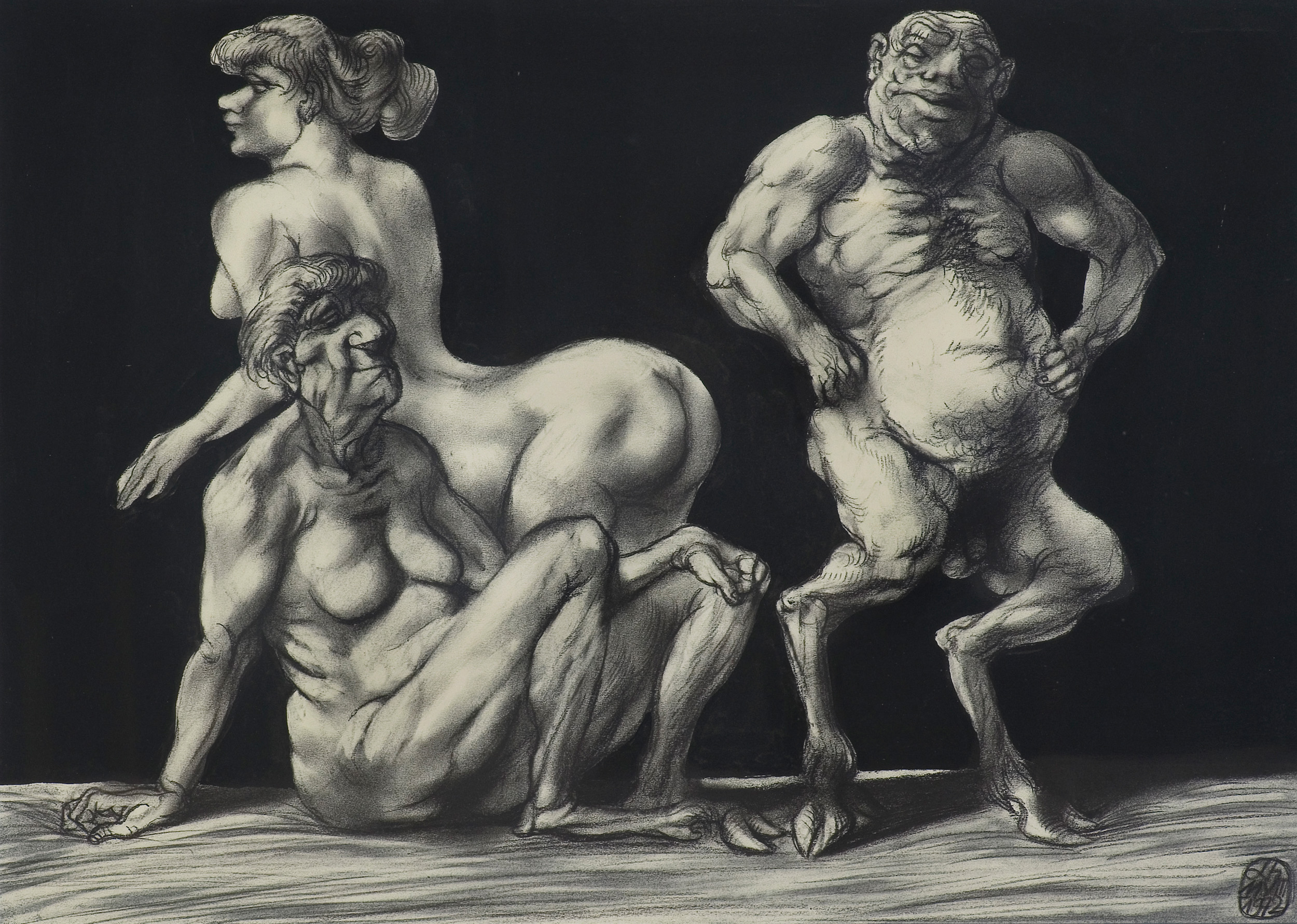 Adam Hoffmann (Kraków 1918 - Kraków 2001) zaczął naukę w 1938 w prywatnej szkole malarstwa A.Terleckiego w Krakowie. Kontynuował studia w latach 1940-42 w krakowskiej Kunstgewerbeschule (będącej zakonspirowaną przedwojenną Akademią). W latach okupacji nawiązał kontakty z gronem artystów skupionych wokół Tadeusza Kantora, późniejszych członków Grupy Młodych Plastyków i od 1957 Grupy Krakowskiej (do której jednak nie przystąpił). W latach 1945-48 dopełnił studiów na Wydziale Malarstwa ASP w Krakowie pod kierunkiem Eugeniusza Eibischa, uczył się też grafiki u Konrada Srzednickiego. Od 1949 był pedagogiem w liceach plastycznych w Katowicach i Krakowie. Od 1950 był związany z Wydziałem Grafiki – filią krakowskiej ASP w Katowicach. W 1974 przeniósł się do ASP w Krako-wie, gdzie prowadził pracownię rysunku na Wydziale Grafiki do emerytury w 1978. Uczył m.in. póź-niejszych członków grupy „Wprost”, z którymi utrzymywał kontakty i powinowactwo artystyczne w późniejszych latach, będąc przez nich traktowany jako nestor i autorytet, również moralny. Choć zajmował się malarstwem sztalugowym, w sposób najbardziej charakterystyczny wypowiedział się w rysunkach pastelem, węglem i tuszem, o kolorystyce ograniczonej lub wręcz monochromatycznych. W realistycznym, nieco karykaturalnym stylu przedstawiał międzyludzkie konflikty, uczucia i sytuacje z pozoru codzienne, nasycone jednak refleksją o charakterze szerszym, egzystencjalnym. Zajmował się również grafiką użytkową i ilustracją, jest autorem publikacji z zakresu nauczania w szkolnictwie artystycznym.